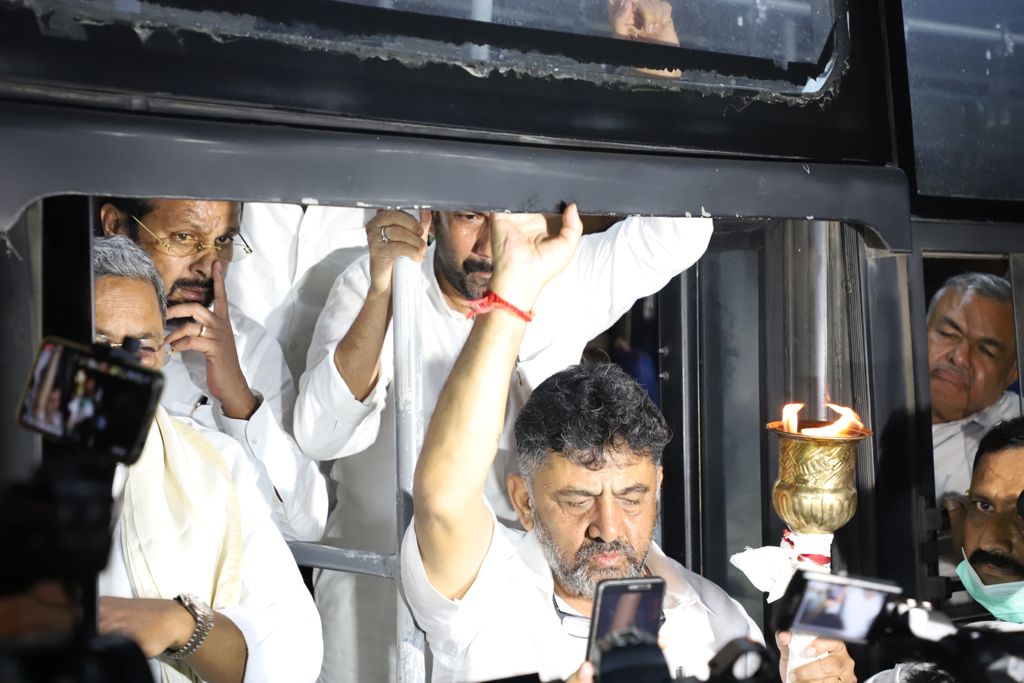 ಸೋಮವಾರ ಇಲ್ಲಿನ ಕ್ವೀನ್ಸ್ ರಸ್ತೆಯ ಕೆಪಿಸಿಸಿ ಕಚೇರಿ ಮುಂಭಾಗ ಕೆಪಿಸಿಸಿ ಅಧ್ಯಕ್ಷ ಡಿ.ಕೆ.ಶಿವಕುಮಾರ್, ವಿರೋಧ ಪಕ್ಷದ ನಾಯಕ ಸಿದ್ದರಾಮಯ್ಯ ನೇತೃತ್ವದಲ್ಲಿ ಜಮಾಯಿಸಿದ ಕಾಂಗ್ರೆಸ್ ಕಾರ್ಯಕರ್ತರು, ರಾಜಭವನದ ವರೆಗೂ ಪಂಜಿನ ಮೆರವಣಿಗೆ ನಡೆಸಿ, ಕೇಂದ್ರ ಹಾಗೂ ಯುಪಿ ಸರಕಾರದ ವಿರುದ್ಧ ಆಕ್ರೋಶ ಹೊರಹಾಕಿದರು.