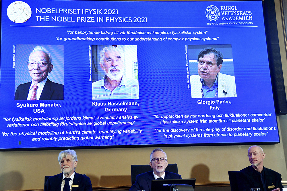 ಸ್ಟಾಕ್ಹೋಂ, ಸೆ. 25: 2021ನೇ ಸಾಲಿನ ಭೌತಶಾಸ್ತ್ರದ ನೊಬೆಲ್ ಪುರಸ್ಕಾರಗಳನ್ನು ಮಂಗಳವಾರ ಘೋಷಿಸಲಾಗಿದ್ದು, ವಿಜ್ಞಾನಿಗಳಾದ ಸಿಯುಕುರೊ ಮನಾಬೆ, ಕ್ಲಾವುಸ್ ಹ್ಯಾಸೆಲ್ಮ್ಯಾನ್ ಹಾಗೂ ಗಿಯೊರ್ಗಿಯೊ ಪಾರ್ಸಿ ಅವರು ಹಂಚಿಕೊಂಡಿದ್ದಾರೆ. ಸಂಕೀರ್ಣವಾದ ಭೌತ ವ್ಯವಸ್ಥೆಗಳ ಕುರಿತ ನಮ್ಮ ತಿಳುವಳಿಕೆಗೆ ಈ ಮೂವರು ನೀಡಿದ ಅಭೂತಪೂರ್ವ ಕೊಡುಗೆಗಾಗಿ ಅವರಿಗೆ ಪುರಸ್ಕಾರ ಸಂದಿದೆ.