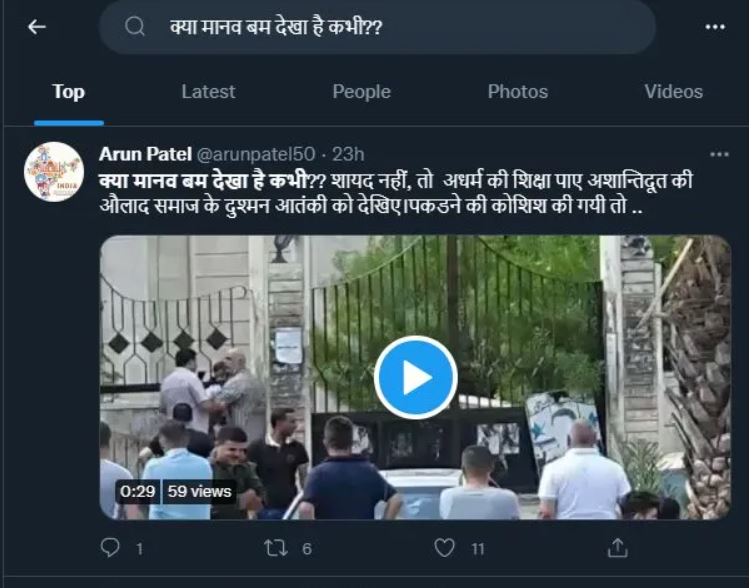 ಜನರ ಗುಂಪಿನ ನಡುವೆ ಜಟಾಪಟಿ ನಡೆದ ಬಳಿಕ ಹಠಾತ್ ಸ್ಫೋಟವಾಗುವ ವೀಡಿಯೊವೊಂದನ್ನು ಸಾಮಾಜಿಕ ಮಾಧ್ಯಮದಲ್ಲಿ ಹಂಚಿಕೊಳ್ಳಲಾಗುತ್ತಿದೆ. ವೀಡಿಯೊದ ಜೊತೆಗೆ "ಅಶಾಂತಿದೂತನ ಸಂತತಿ" ಎಂದು ಬರೆಯಲಾಗಿದೆ. ‘ಶಾಂತಿದೂತ್’ ಮುಸ್ಲಿಂ ಸಮುದಾಯವನ್ನು ಉಲ್ಲೇಖಿಸಲು ಆನ್ಲೈನ್ನಲ್ಲಿ ಬಳಸಲಾಗುವ ಪದವಾಗಿದೆ. ಇದು ಸಿರಿಯಾದಲ್ಲಿ ನಡೆದ ಘಟನೆಯಾಗಿದ್ದು, ಘಟನೆಯನ್ನು ತಿರುಚಿ ಪ್ರಸಾರ ಮಾಡಲಾಗುತ್ತಿದೆ ಎಂದು altnews.in ತನ್ನ ಸತ್ಯಶೋಧನಾ ವರದಿಯಲ್ಲಿ ತಿಳಿಸಿದೆ.