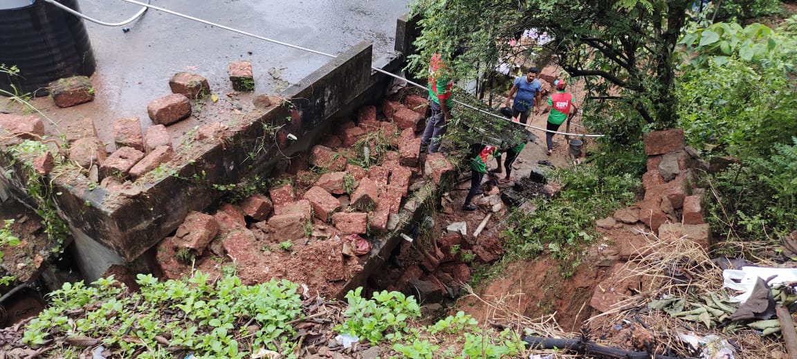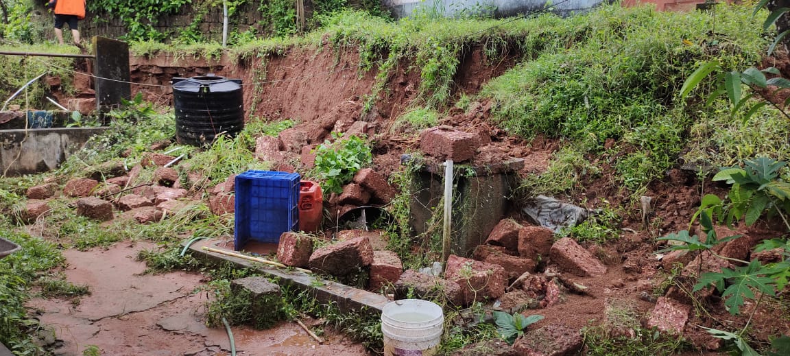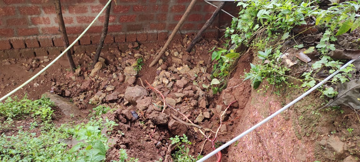 ನಗರದ ಹೊರವಲಯದಲ್ಲಿನ ನೀರು ಮಾರ್ಗದಲ್ಲಿ ಕಂಪೌಂಡ್ ಗೋಡೆ ಹಾಗೂ ವಿದ್ಯುತ್ ಕಂಬ ಕುಸಿದು ಮನೆಗೆ ಭಾಗಶಃ ಹಾನಿಯಾಗಿದೆ. ಪಕ್ಕದಲ್ಲೇ ಸಣ್ಣ ಗುಡ್ಡ ಕುಸಿತ ಸಂಭವಿಸಿದೆ.