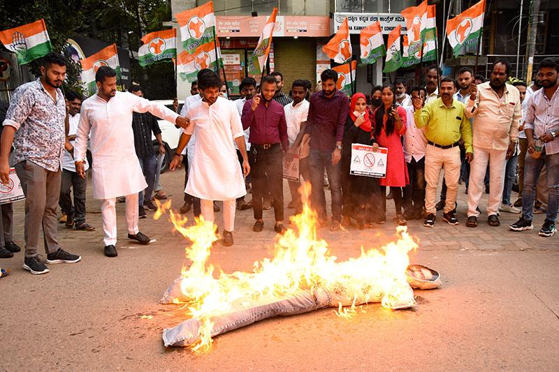 ಪ್ರತಿಕೃತಿ ದಹನ: ಕಾಂಗ್ರೆಸ್ನ ರಾಷ್ಟ್ರೀಯ ಮುಖಂಡ ರಾಹುಲ್ ಗಾಂಧಿ ಬಗ್ಗೆ ಅವಹೇಳನಕಾರಿ ಹೇಳಿಕೆ ನೀಡಿದ ನಳಿನ್ ಕುಮಾರ್ ವಿರುದ್ಧ ಯುವ ಕಾಂಗ್ರೆಸ್ನಿಂದ ಅವರ ಪ್ರತಿಕೃತಿಗೆ ಬೆಂಕಿ ಹಚ್ಚಿ, ಆಕ್ರೊಶ ವ್ಯಕ್ತಪಡಿಸಲಾಯಿತು. ಬೆಂಕಿಯಲ್ಲಿ ಬೇಯುತ್ತಿದ್ದ ಪ್ರತಿಕೃತಿಗೂ ಕಾರ್ಯಕರ್ತರು ಬೂಟುಗಾಲಿನಿಂದ ಒದ್ದು, ತುಳಿದು ತಮ್ಮ ಆಕ್ರೋಶದ ಕಿಚ್ಚನ್ನು ಹೊರಹಾಕಿದರು.