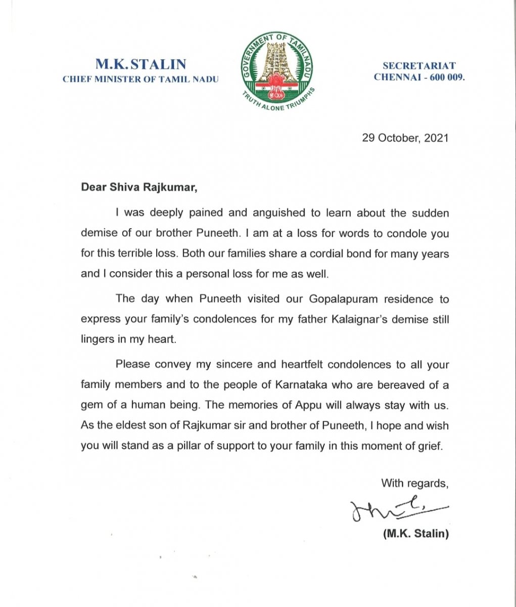 'ಕರ್ನಾಟಕವು ಅಮೂಲ್ಯವಾದ ರತ್ನವನ್ನು ಮಾನವತಾವಾದಿಯನ್ನು ಕಳೆದುಕೊಂಡಿದೆ. ಅಪ್ಪು ನಮ್ಮ ಮಧ್ಯೆ ಇಲ್ಲವಾದರೂ ಅವರ ನೆನೆಪು ಸದಾ ನಮ್ಮೊಂದಿಗೆ ಇರುತ್ತದೆ. ದಿ. ರಾಜ ಕುಮಾರ್ ಅವರ ಹಿರಿಯ ಮಗನಾಗಿರುವ ನೀವು ಈ ದುಃಖ ದ ಗಳಿಗೆಯಲ್ಲೂ ಆತ್ಮಸ್ಥೈರ್ಯ ತುಂಬಿಕೊಂಡು ಕುಟುಂಬಸ್ಥರೊಂದಿಗೆ ನಿಲ್ಲುತ್ತೀರಿ ಎಂದು ಭಾವಿಸುತ್ತೇನೆ' ಎಂದು ಎಂ.ಕೆ ಸ್ಟಾಲಿನ್ ಪುನೀತ್ ರಾಜ್ ಕುಮಾರ್ ಅವರನ್ನು ಸಹೋದರ ಎಂದೇ ಉಲ್ಲೇಖಿಸಿ ನಟ ಶಿವರಾಜ್ ಕುಮಾರ್ ಗೆ ಸಂತಾಪ ಪತ್ರ ಬರೆದಿದ್ದಾರೆ.