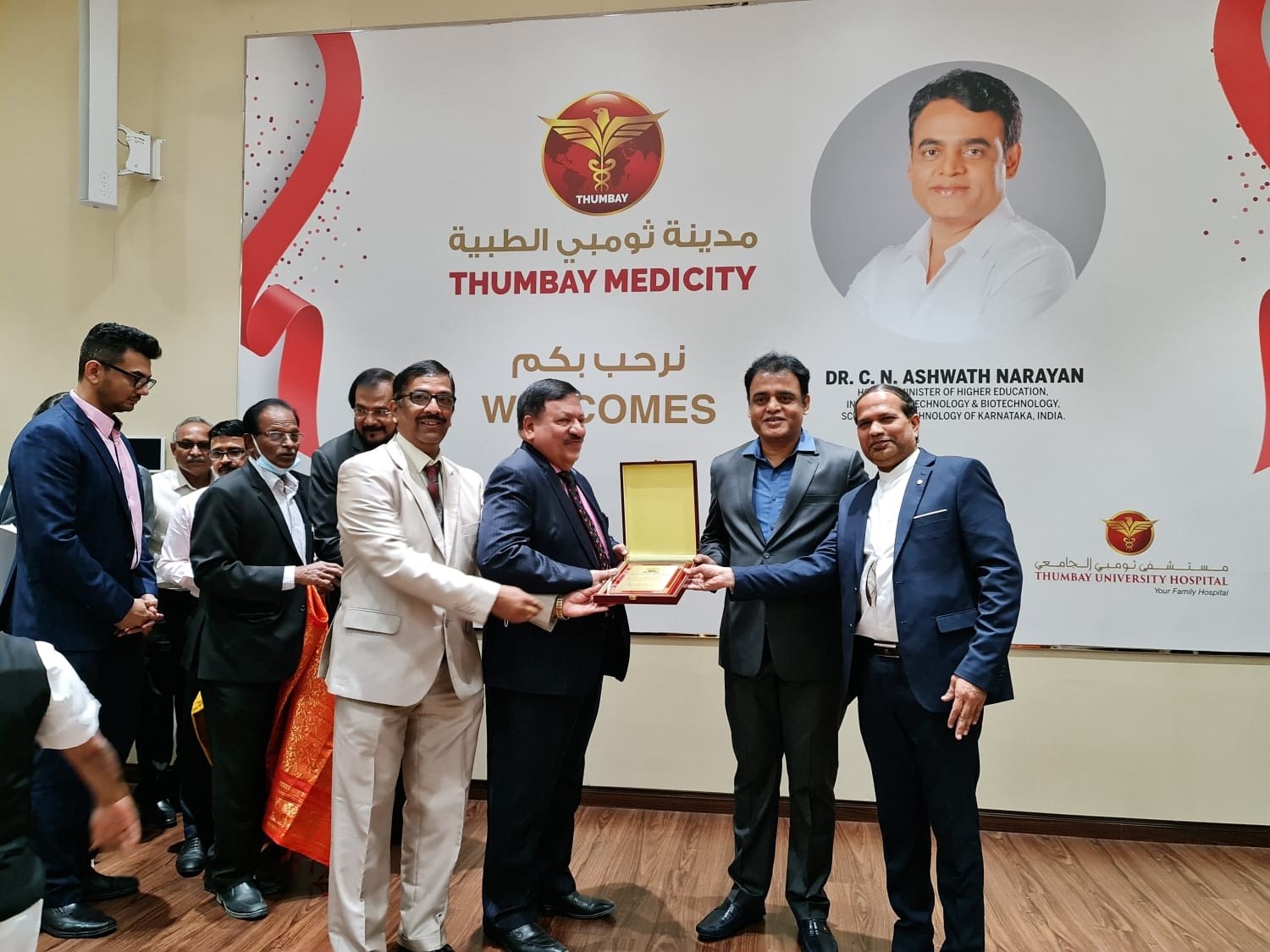 ಅಜ್ಮಾನ್ನ ಗಲ್ಫ್ ಮೆಡಿಕಲ್ ಯುನಿವರ್ಸಿಟಿಯ ಸಭಾಂಗಣದಲ್ಲಿ ಬಿಸಿಎಫ್ ಅಧ್ಯಕ್ಷ ಬಿ.ಕೆ.ಯೂಸುಫ್ ಅಧ್ಯಕ್ಷತೆಯಲ್ಲಿ ಜರುಗಿದ ಕಾರ್ಯಕ್ರಮದಲ್ಲಿ ಸಚಿವ ಡಾ.ಸಿ.ಎನ್.ಅಶ್ವತ್ಥ ನಾರಾಯಣರನ್ನು ಕರ್ನಾಟಕದ ಉನ್ನತ ಶಿಕ್ಷಣ, ವಿಜ್ಞಾನ, ಮಾಹಿತಿ ತಂತ್ರಜ್ಞಾನ, ಜೈವಿಕ ವಿಜ್ಞಾನ ಮತ್ತು ತಾಂತ್ರಿಕ ಕ್ಷೇತ್ರದಲ್ಲಿ ಸಲ್ಲಿಸುತ್ತಿರುವ ಸೇವೆಯನ್ನುಪರಿಗಣಿಸಿ ವಿಶೇಷ ಸ್ಮರಣ ಫಲಕ ನೀಡಿ ಸನ್ಮಾನಿಸಲಾಯಿತು.
