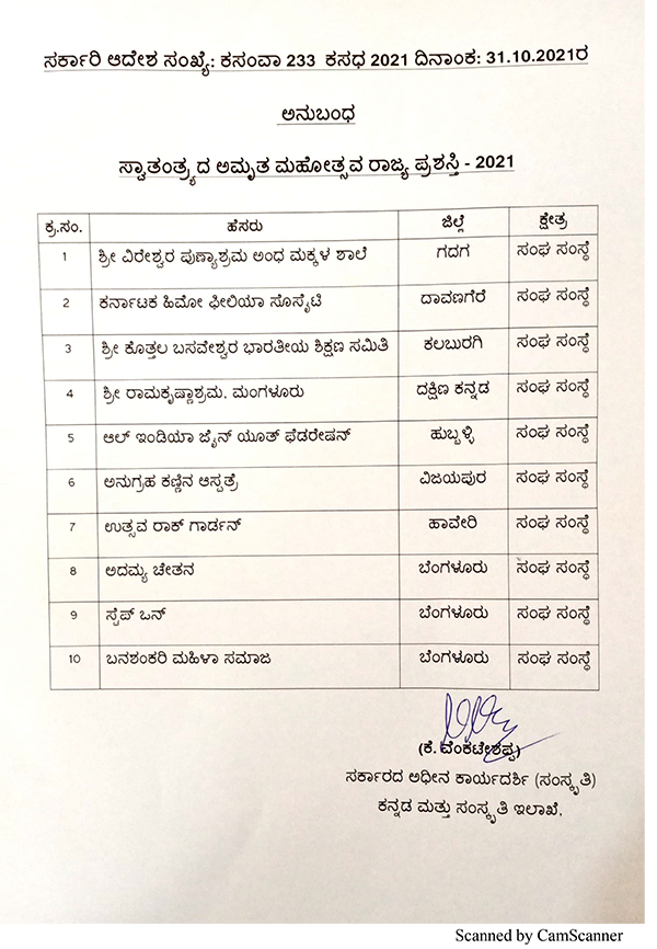 10 ಸಂಘ ಸಂಸ್ಥೆಗಳಿಗೆ ಸ್ವಾತಂತ್ರ್ಯದ ಅಮೃತ ಮಹೋತ್ಸವ ರಾಜ್ಯ ಪ್ರಶಸ್ತಿ