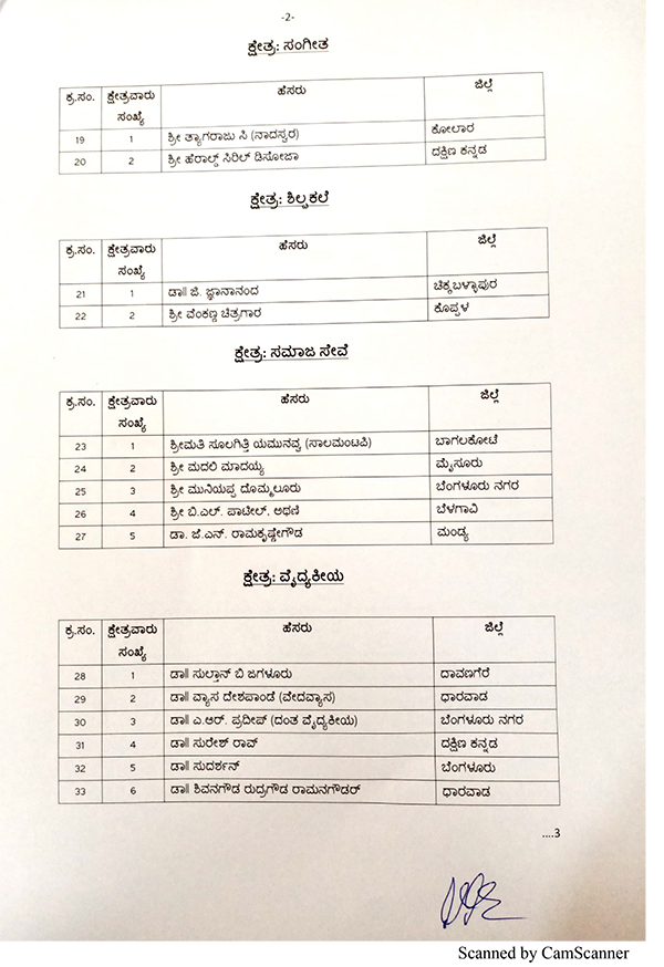 ►ಸಂಗೀತ: ಕೋಲಾರ ಜಿಲ್ಲೆಯ ತ್ಯಾಗರಾಜು ಸಿ(ನಾದಸ್ವರ) ಹಾಗೂ ಹೆರಾಲ್ಡ್ ಸಿರಿಬ್ ಡಿಸೋಜಾ(ದಕ್ಷಿಣ ಕನ್ನಡ). ಶಿಲ್ಪಕಲೆ: ಡಾ.ಜಿ.ಜ್ಞಾನಾನಂದ(ಚಿಕ್ಕಬಳ್ಳಾಪುರ) ಹಾಗೂ ವೆಂಕಣ್ಣ ಚಿತ್ರಗಾರ(ಕೊಪ್ಪಳ). ಸಮಾಜ ಸೇವೆ: ಬಾಗಲಕೋಟೆ ಜಿಲ್ಲೆಯ ಸೂಲಗಿತ್ತಿ ಯಮುನವ್ವ(ಸಾಲಮಂಟಪಿ), ಮದಲಿ ಮಾದಯ್ಯ(ಮೈಸೂರು), ಮುನಿಯಪ್ಪ ದೊಮ್ಮಲೂರು(ಬೆಂಗಳೂರು ನಗರ), ಬಿ.ಎಲ್.ಪಾಟೀಲ್(ಬೆಳಗಾವಿ ಜಿಲ್ಲೆಯ ಅಥಣಿ) ಹಾಗೂ ಡಾ.ಜೆ.ಎನ್.ರಾಮಕೃಷ್ಣೇಗೌಡ(ಮಂಡ್ಯ).