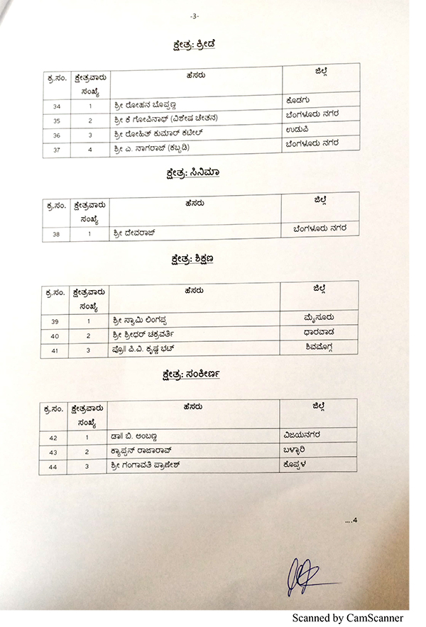 ►ಕ್ರೀಡೆ: ರೋಹನ್ ಬೊಪ್ಪಣ್ಣ(ಕೊಡಗು), ಕೆ.ಗೋಪಿನಾಥ್(ವಿಶೇಷ ಚೇತನ)-ಬೆಂಗಳೂರು ನಗರ, ರೋಹಿತ್ ಕುಮಾರ್ ಕಟೀಲ್(ಉಡುಪಿ), ಎ.ನಾಗರಾಜ್(ಕಬ್ಬಡ್ಡಿ)-ಬೆಂಗಳೂರು ನಗರ.