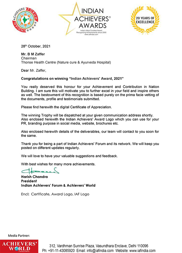 ಹೊಸದಿಲ್ಲಿ: ಇಂಡಿಯನ್ ಅಚೀವರ್ಸ್ ಫೋರಂ ನೀಡುವ ʼಇಂಡಿಯನ್ ಅಚೀವರ್ಸ್ ಅವಾರ್ಡ್ʼ ಗೆ ತೋನ್ಸೆಯ ಪ್ರಕೃತಿ ಶಮನ ಮತ್ತು ಆಯುರ್ವೇದ ಆಸ್ಪತ್ರೆ 'ತೋನ್ಸೆ ಹೆಲ್ತ್ ಸೆಂಟರ್' ನ ಅಧ್ಯಕ್ಷ ಬಿ.ಎಂ.ಝಫರ್ ಪಾತ್ರರಾಗಿದ್ದಾರೆ.