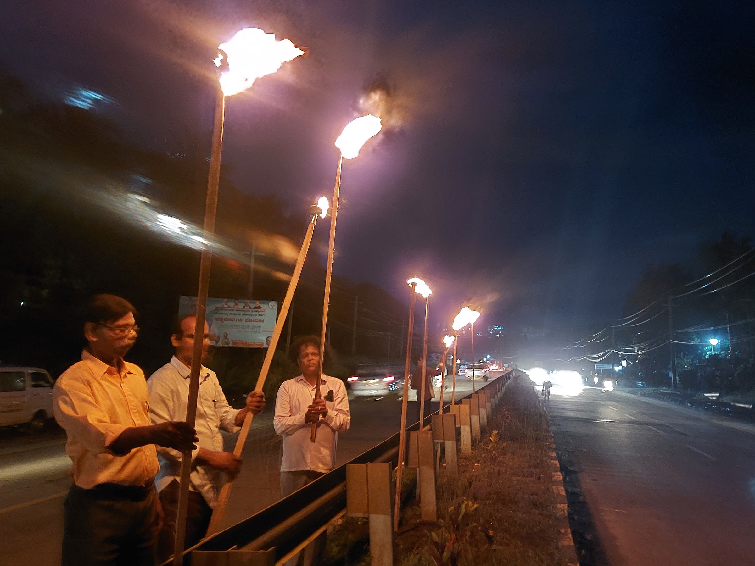 ದೊಂದಿಬೆಳಕಿನ ಕಂಬಗಳನ್ನು ಹಿಡಿದು ವಿಶಿಷ್ಟ ರೀತಿಯ ಪ್ರತಿಭಟನೆ