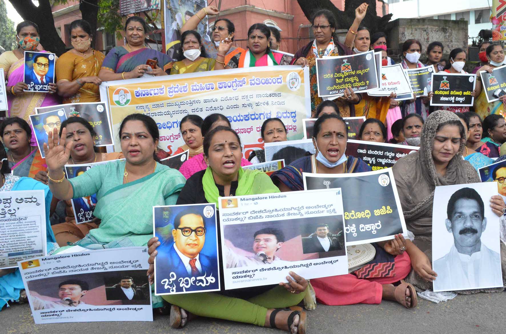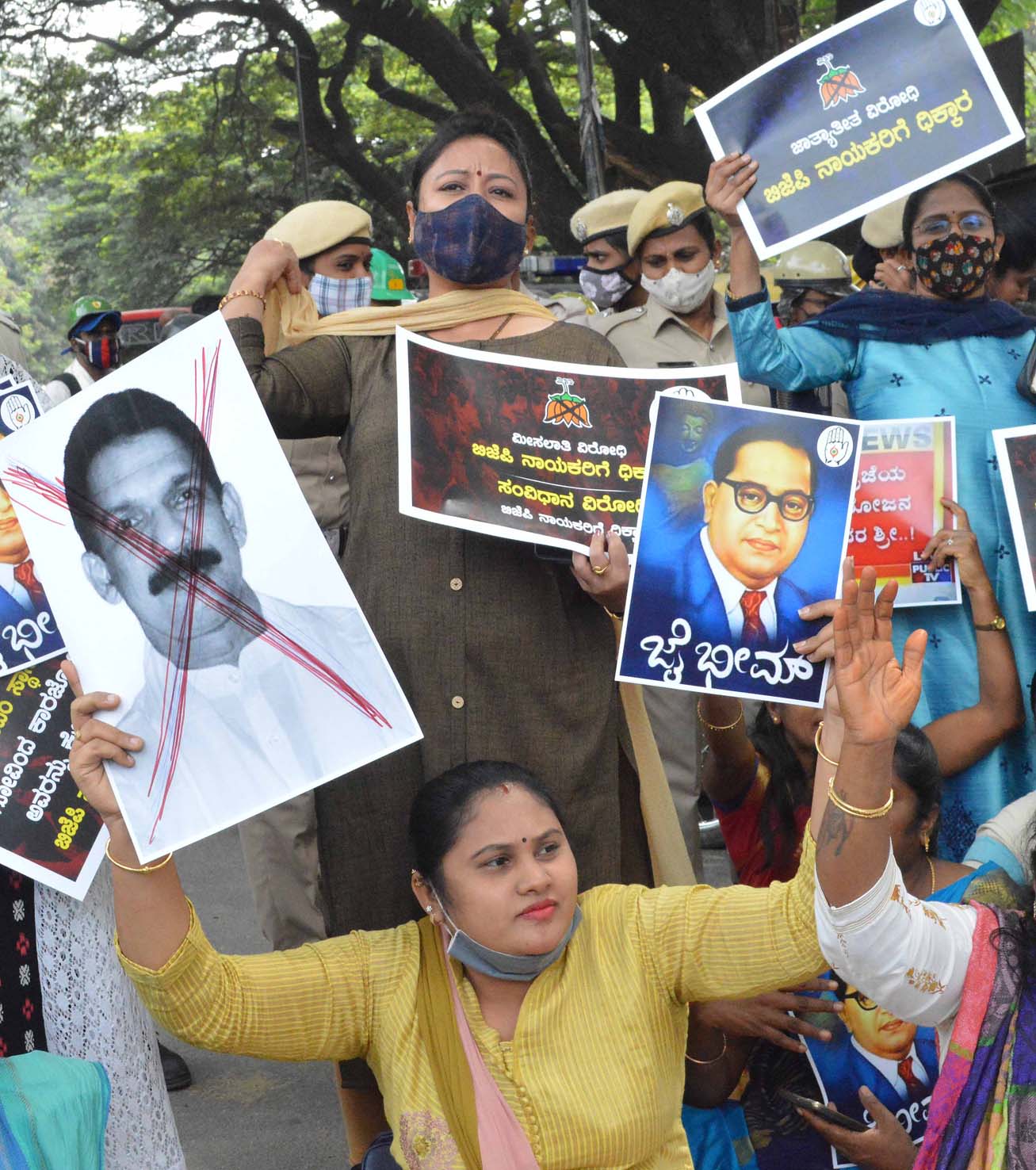 ಮಂಗಳವಾರ ನಗರದ ಮೈಸೂರ್ ಬ್ಯಾಂಕ್ ಬಳಿ ಕೆಪಿಸಿಸಿ ಮಹಿಳಾ ಘಟಕದ ಕಾಂಗ್ರೆಸ್ ಅಧ್ಯಕ್ಷೆ ಪುಷ್ಪಾ ಅಮರನಾಥ್ ಅವರ ನೇತೃತ್ವದಲ್ಲಿ ಪ್ರತಿಭಟನೆ ನಡೆಸಿದ ಮಹಿಳಾ ಸದಸ್ಯರು, ಬಿಜೆಪಿ ನಿಜವಾಗಿ ದಲಿತ ವಿರೋಧಿ ಎಂದು ಆಕ್ರೋಶ ವ್ಯಕ್ತಪಡಿಸಿದರು.