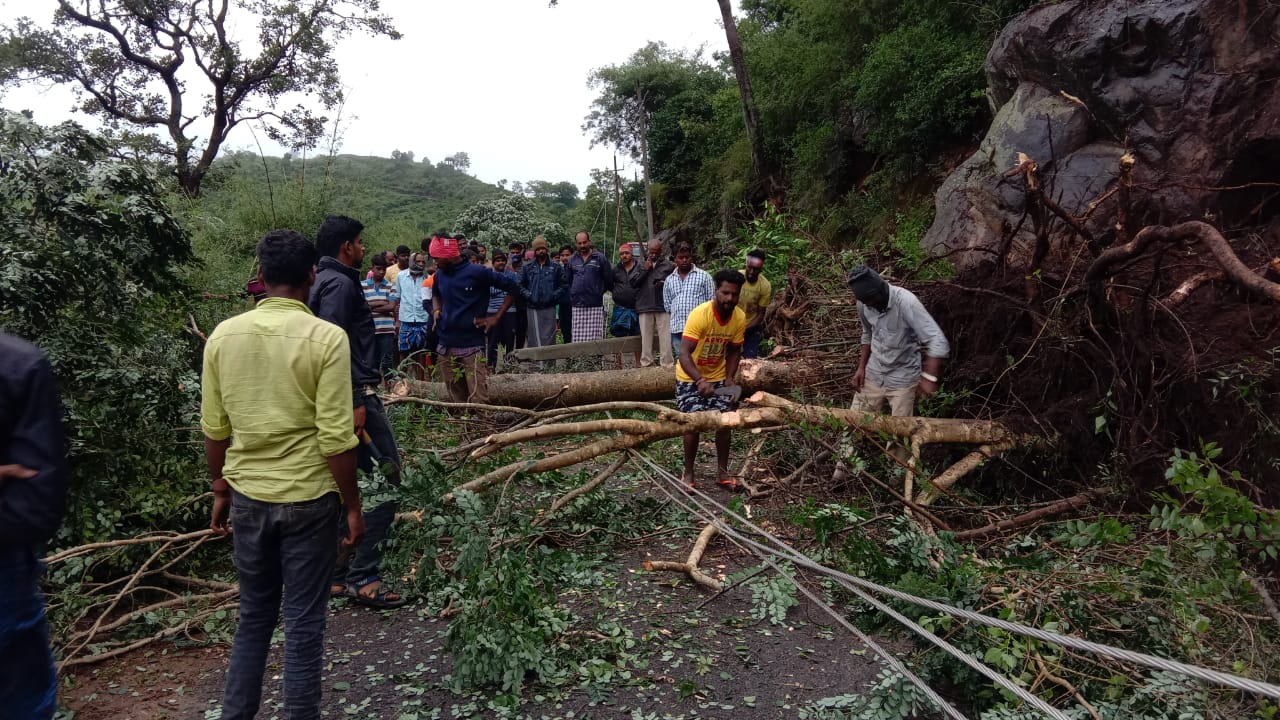 ತಾಲೂಕಿನಾದ್ಯಂತ ಭಾರೀ ಮಳೆ ಮುಂದುವರಿದಿದ್ದು, ಕಳೆದ ರಾತ್ರಿ ತಾಳಬೆಟ್ಟ ಹಾಗೂ ಪೂನ್ನಾಚ್ಚಿ ರಸ್ತೆ ಮಧ್ಯೆ ಮರಗಳು ಉರುಳಿ ವಿದ್ಯುತ್ ತಂತಿ ಮೇಲೆ ಬಿದ್ದ ಪರಿಣಾಮ ಹಲವು ವಿದ್ಯುತ್ ಕಂಬಗಳು ಧರೆಗುರುಳಿವೆ. ಇದರಿಂದ ವಾಹನ ಸಂಚಾರಕ್ಕೆ ತೂಡಕುಂಟಾಗಿತ್ತು. ಬಳಿಕ ಪೂನ್ನಾಚ್ಚಿ ಗ್ರಾಮಸ್ಥರು ಮರಗಳನ್ನು ತೆರವುಗೊಳಿಸಿದರು.