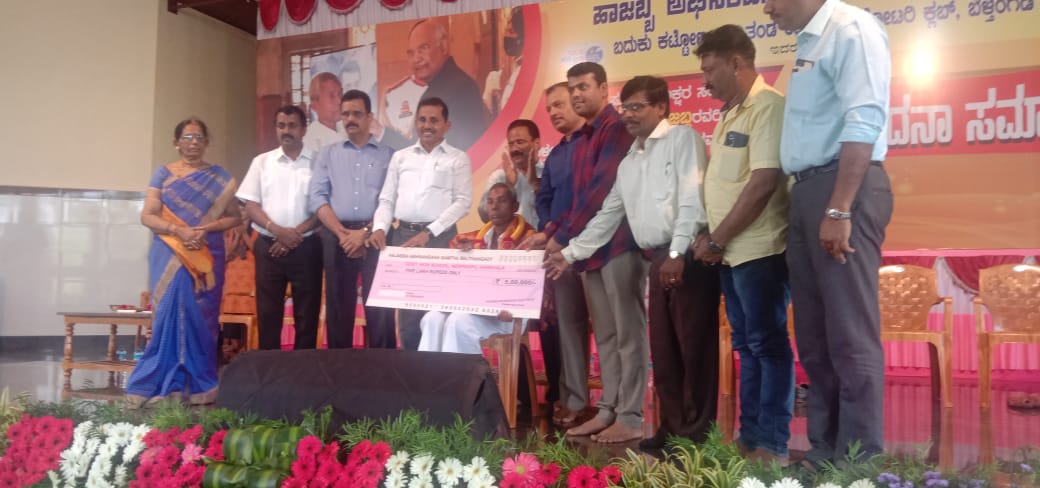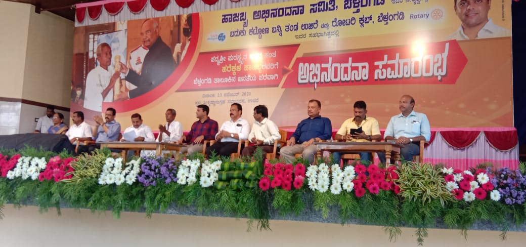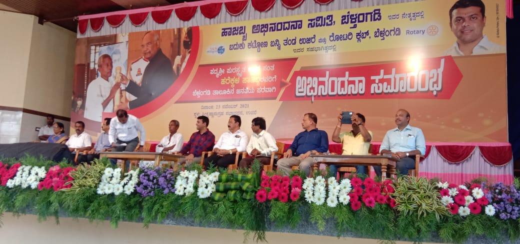 'ಬದುಕು ಕಟ್ಟೋಣ ಬನ್ನಿ' ತಂಡ ಉಜಿರೆ ಹಾಗೂ ರೋಟರಿ ಕ್ಲಬ್ ಉಜಿರೆ ಇದರ ಸಹಭಾಗಿತ್ವದಲ್ಲಿ ನಡೆದ ಅಭಿನಂದನಾ ಸಮಾರಂಭದ ಅಧ್ಯಕ್ಷತೆಯನ್ನು ಶಾಸಕ ಹರೀಶ್ ಪೂಂಜ ವಹಿಸಿದ್ದರು. ನಂತರ ಮಾತನಾಡಿದ ಅವರು, ಹಾಜಬ್ಬ ಅಭಿನಂದನಾ ಸಮಿತಿಯಿಂದ ಹರೇಕಳ ಶಾಲೆಗೆ ಒಂದು ಶಾಲಾ ಕೊಠಡಿ ನಿರ್ಮಾಣ ಕಾರ್ಯಕ್ಕೆ 5 ಲಕ್ಷ ಸಹಾಯಧನ ಹಾಗೂ ಬದುಕು ಕಟ್ಟೋಣ ಬನ್ನಿ ತಂಡ ಹಾಗೂ ಬೆಳ್ತಂಗಡಿ ರೋಟರಿ ಕ್ಲಬ್ ವತಿಯಿಂದ ಶಾಲೆಗೆ 20 ಸಾವಿರ ಮೌಲ್ಯದ ಕ್ರೀಡಾ ಸಾಮಗ್ರಿಗಳು ಮತ್ತು 80 ಸಾವಿರ ರೂ. ಮೌಲ್ಯದ ಪೀಠೋಪಕರಣಗಳನ್ನು ಕೊಡುಗೆಯಾಗಿ ನೀಡುವ ಮೂಲಕ ಹಾಜಬ್ಬರನ್ನು ಅಭಿನಂದಿಸುತ್ತಿರುವುದಾಗಿ ತಿಳಿಸಿದರು.