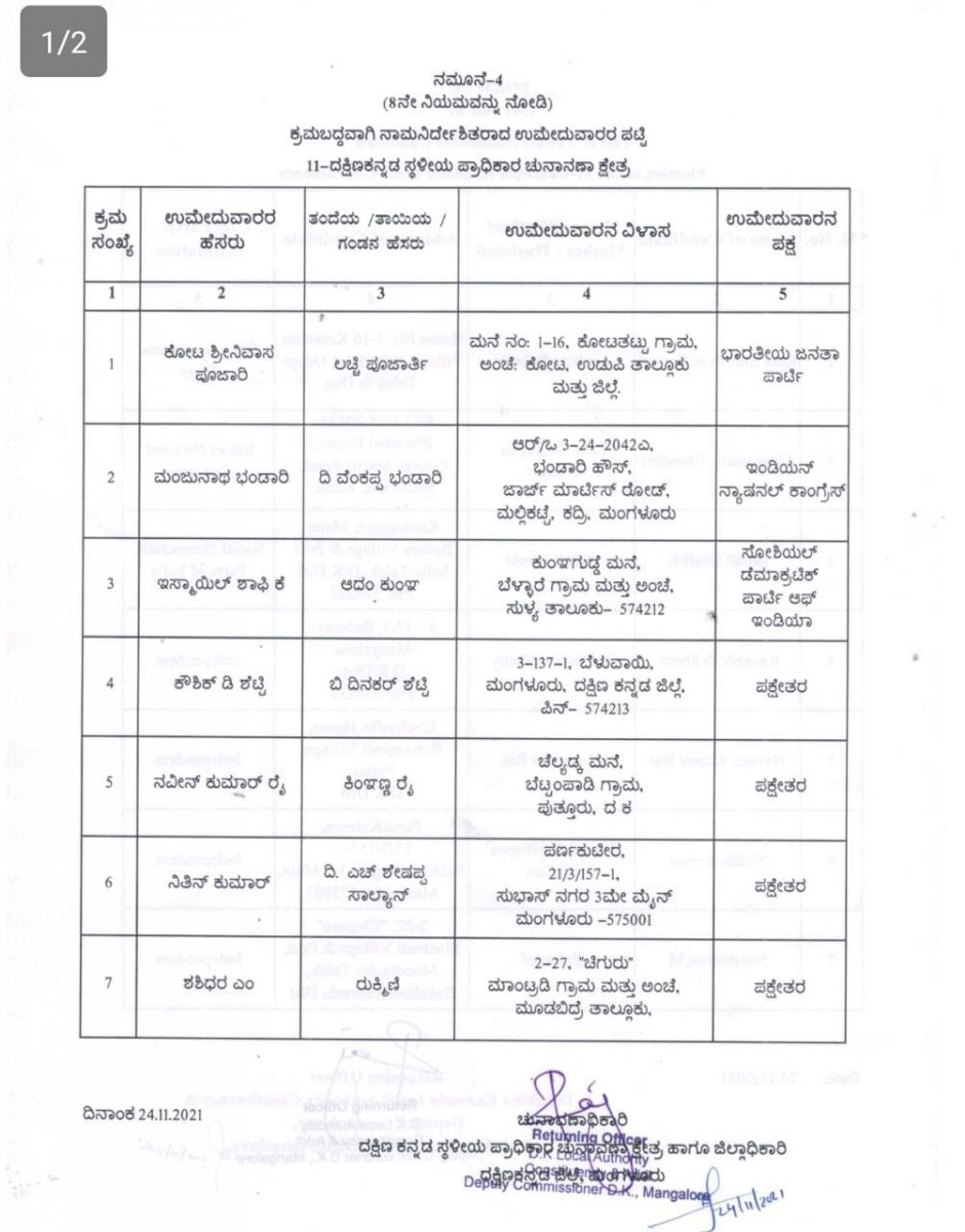 ಬುಧವಾರ ನಾಮಪತ್ರಗಳನ್ನು ಪರಿಶೀಲಿಸಲಾಗಿದ್ದು, 8 ಮಂದಿಯ ಪೈಕಿ ಪಕ್ಷೇತರ ಅಭ್ಯರ್ಥಿ ಸುಪ್ರೀತ್ ಕುಮಾರ್ ಪೂಜಾರಿ ಅವಯ ನಾಮಪತ್ರ ತಿರಸ್ಕೃತಗೊಂಡಿದೆ. ನ.26ಕ್ಕೆ ನಾಮಪತ್ರ ವಾಪಸ್ ಪಡೆಯಲು ಕೊನೆಯ ದಿನವಾಗಿದೆ.