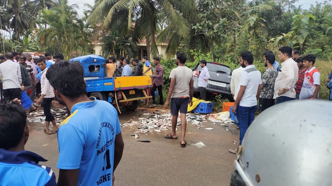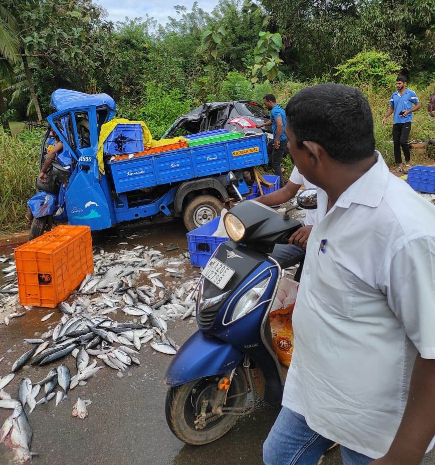 ಮೀನು ಮಾರಾಟದ ಪಿಕಪ್ ಹಾಗೂ ಬೈಕಿಗೆ ಢಿಕ್ಕಿ ಹೊಡೆದ ಕಾರು