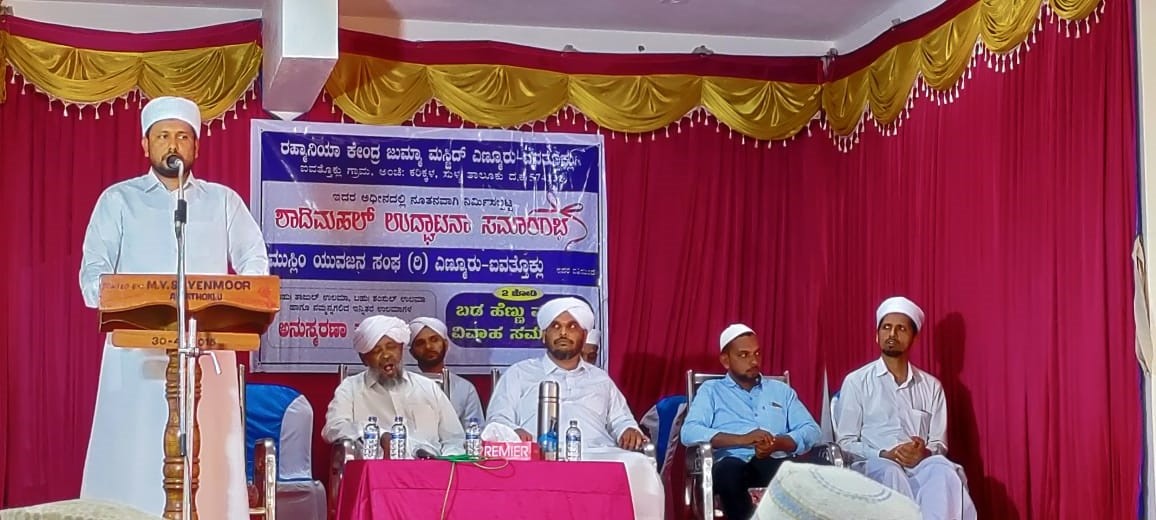 ಸುಳ್ಯ, ಡಿ.6: ತಾಲೂಕಿನ ಎಣ್ಮೂರು ಐವತ್ತೂಕ್ಲು ಕೇಂದ್ರ ರಹ್ಮಾನಿಯಾ ಜುಮಾ ಮಸ್ಜಿದ್ ಅಧೀನದಲ್ಲಿರುವ ನೂತನ ಶಾದಿ ಮಹಲ್ ಉದ್ಘಾಟನೆ, ಮುಸ್ಲಿಂ ಯುವಜನ ಸಂಘದ ಆಶ್ರಯದಲ್ಲಿ ಬಡ ಹೆಣ್ಮಕ್ಕಳ ವಿವಾಹ ಮತ್ತು ಶಂಸುಲ್ ಉಲಮಾ ಹಾಗೂ ತಾಜುಲ್ ಉಲಮಾ ಅನುಸ್ಮರಣೆ ಕಾರ್ಯಕ್ರಮವು ಡಿ.5ರಂದು ನಡೆಯಿತು.