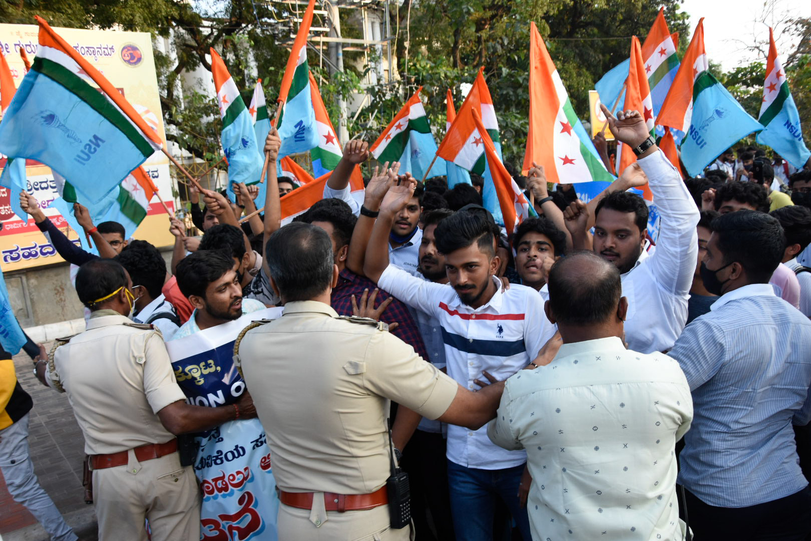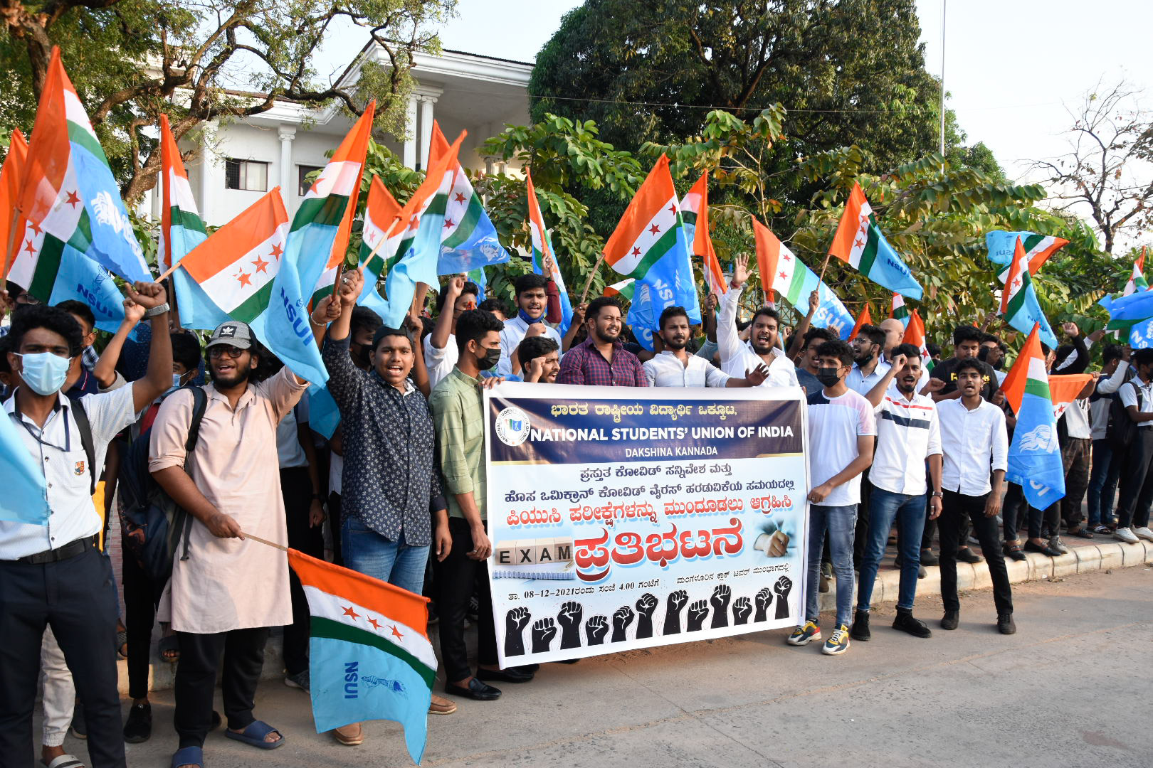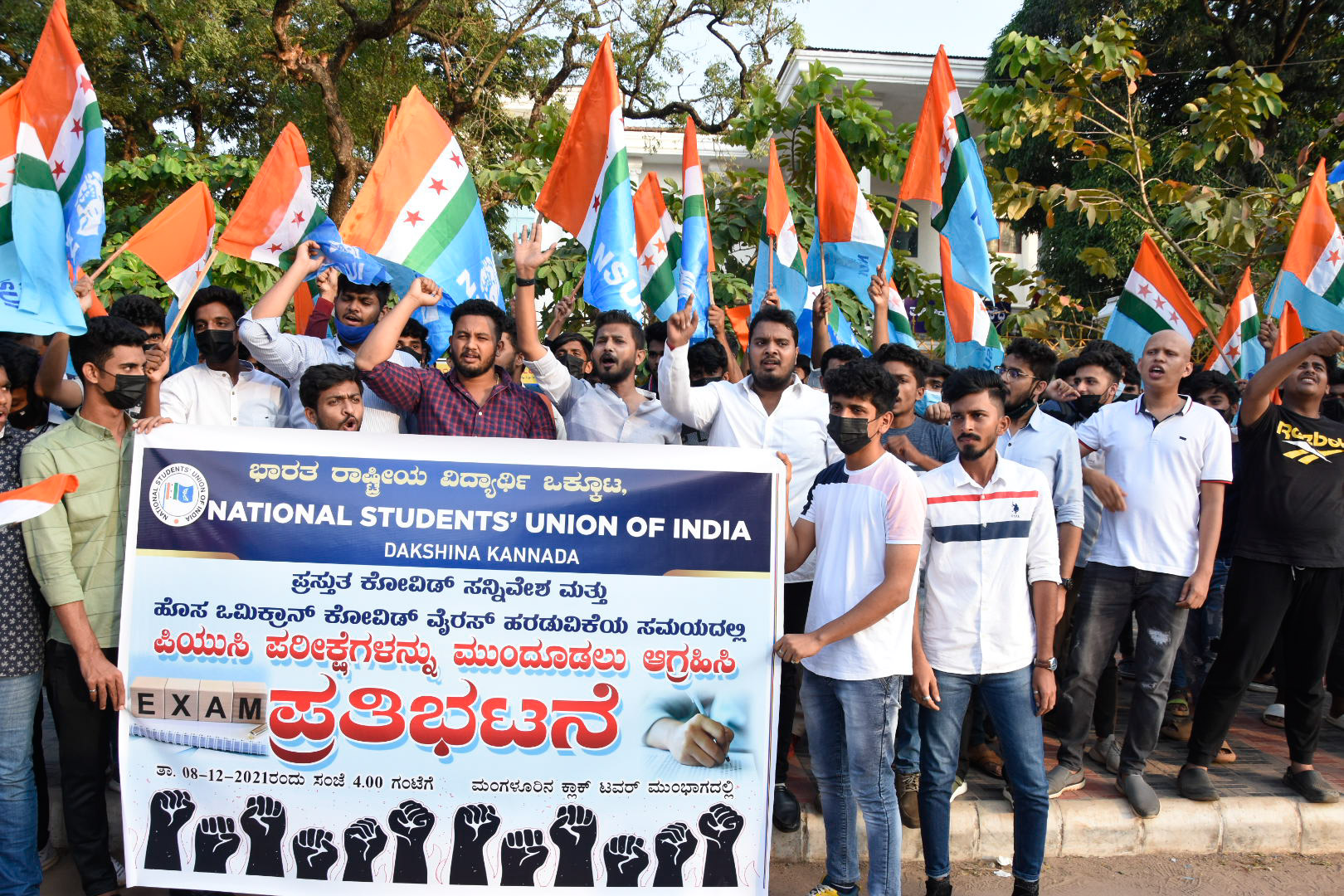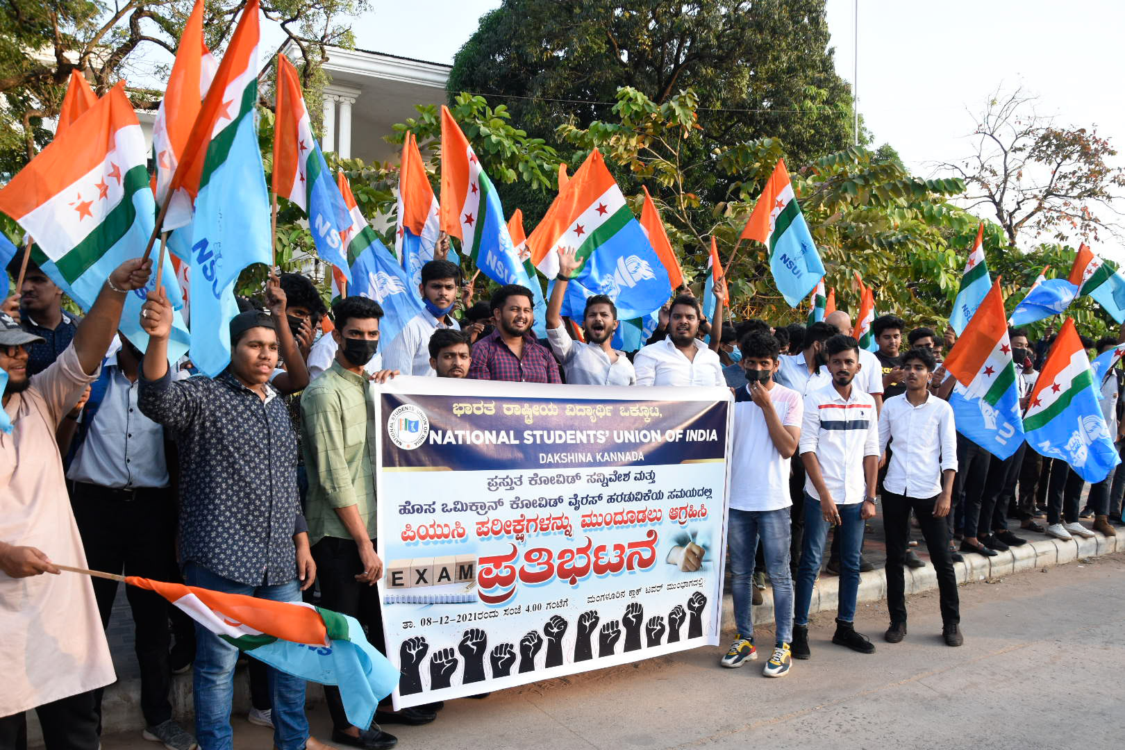 ಮಂಗಳೂರು: ಪಿಯುಸಿ ಪರೀಕ್ಷೆ ಮುಂದೂಡಲು ಆಗ್ರಹಿಸಿ ಎನ್ಎಸ್ಯುಐ ಪ್ರತಿಭಟನೆ