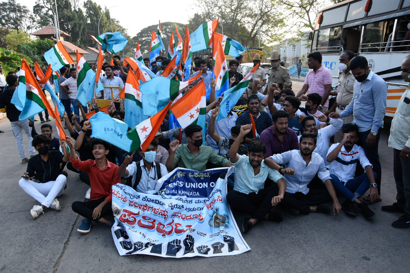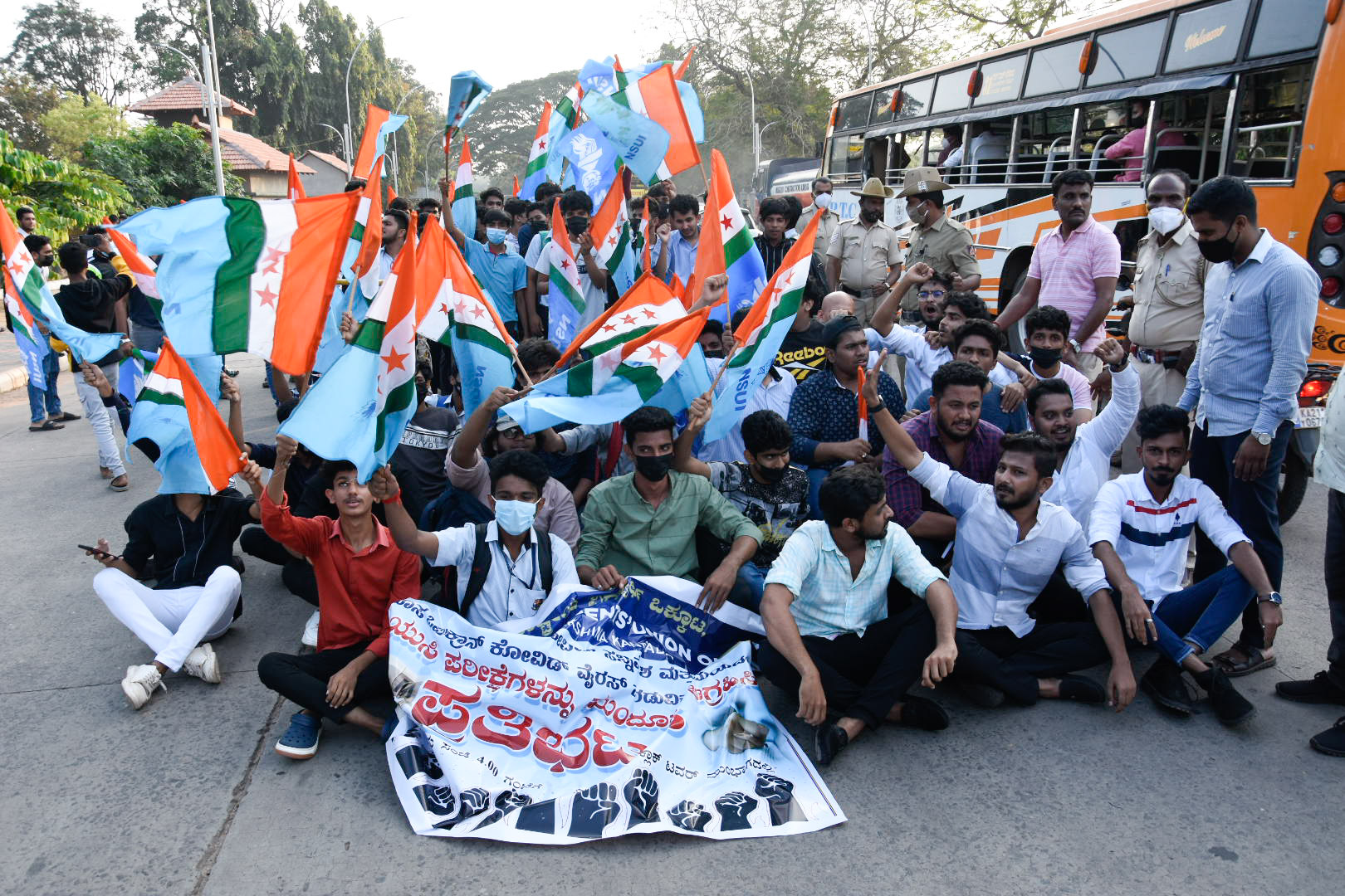 ಮಂಗಳೂರು, ಡಿ.8: ಹೆಚ್ಚುತ್ತಿರುವ ಕೋವಿಡ್ ಪ್ರಕರಣ ಮತ್ತು ಕೋವಿಡ್ ರೂಪಾಂತರ ಒಮಿಕ್ರಾನ್ ವೈರಸ್ ಹರಡುವಿಕೆಯ ಮಧ್ಯೆಯೇ ಪಿಯುಸಿ ಪರೀಕ್ಷೆ ನಡೆಸುವುದನ್ನು ಖಂಡಿಸಿ ಮತ್ತು ಪರೀಕ್ಷೆಯನ್ನು ಮುಂದೂಡುವಂತೆ ಆಗ್ರಹಿಸಿ ಎನ್ಎಸ್ಯುಐ ದ.ಕ.ಜಿಲ್ಲಾ ಸಮಿತಿಯು ಬುಧವಾರ ನಗರದ ಕ್ಲಾಕ್ ಟವರ್ ಬಳಿ ಪ್ರತಿಭಟಿಸಿ, ರಸ್ತೆ ತಡೆ ನಡೆಸಿದರು.