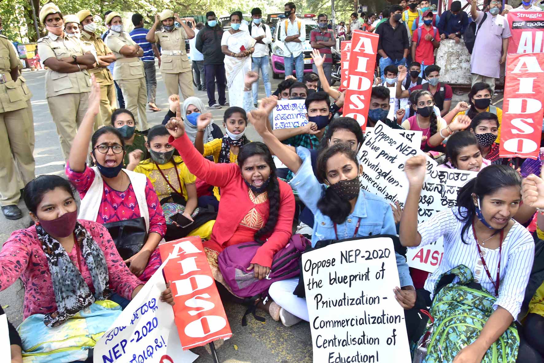 ಬೆಂಗಳೂರು, ಡಿ. 8: ‘ರಾಷ್ಟ್ರೀಯ ಹೊಸ ಶಿಕ್ಷಣ ನೀತಿ(ಎನ್ಇಪಿ) ಹೆಸರಿನಲ್ಲಿ ಹೇರಿರುವ ನಾಲ್ಕು ವರ್ಷದ ಪದವಿ ಕೋರ್ಸ್ ಅನ್ನು ಕೂಡಲೇ ಹಿಂಪಡೆಯಬೇಕೆಂದು ಆಗ್ರಹಿಸಿ ಆಲ್ ಇಂಡಿಯಾ ಡೆಮಾಕೆಟ್ರಿಕ್ ಸ್ಟೂಡೆಂಟ್ಸ್ ಆರ್ಗನೈಜೇಷನ್(ಎಐಡಿಎಸ್ಓ) ನೇತೃತ್ವದಲ್ಲಿ ವಿದ್ಯಾರ್ಥಿಗಳು, ಉಪನ್ಯಾಸಕರು ಧರಣಿ ಸತ್ಯಾಗ್ರಹ ನಡೆಸಿದರು.