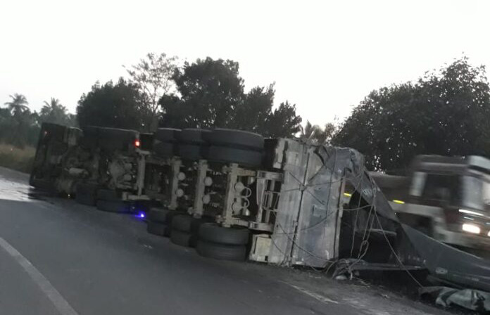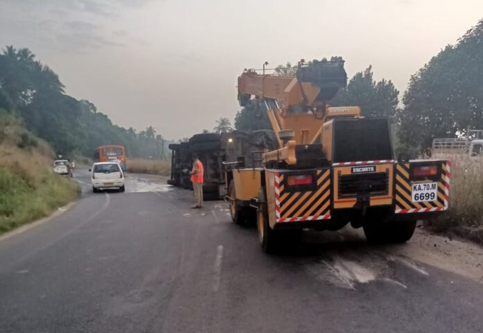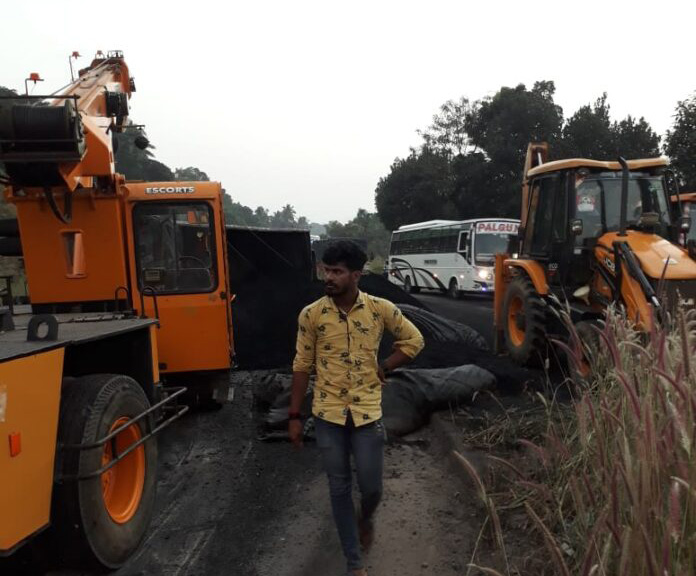 ಮಂಗಳೂರು ಬಂದರಿನಿಂದ ಕಲ್ಲಿದ್ದಲು ತುಂಬಿಸಿದ ಲಾರಿ ಬಳ್ಳಾರಿ ಕಡೆಗೆ ಸಾಗುತ್ತಿದ್ದ ಸಂದರ್ಭದಲ್ಲಿ ತುಂಬೆ ತಿರುವಿನಲ್ಲಿ ಚಾಲಕನ ನಿಯಂತ್ರಣ ಕಳೆದುಕೊಂಡು ಪಲ್ಟಿಯಾಗಿದೆ.