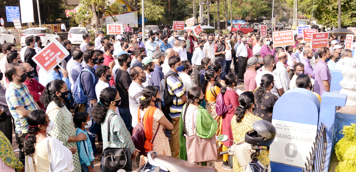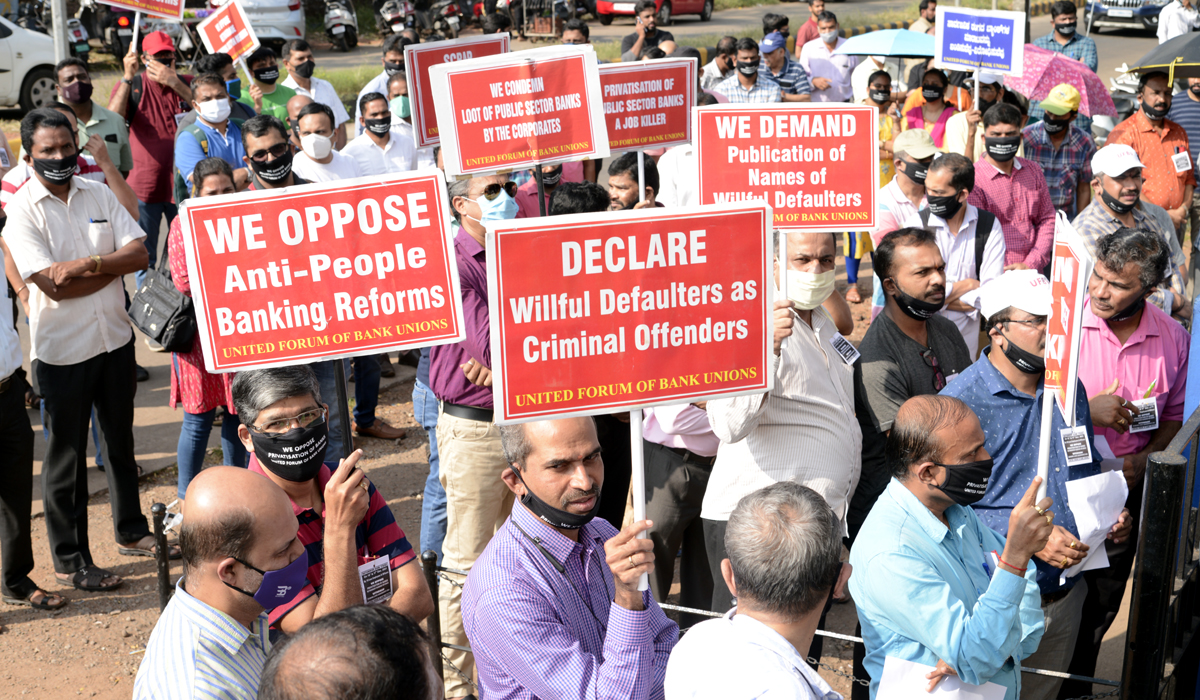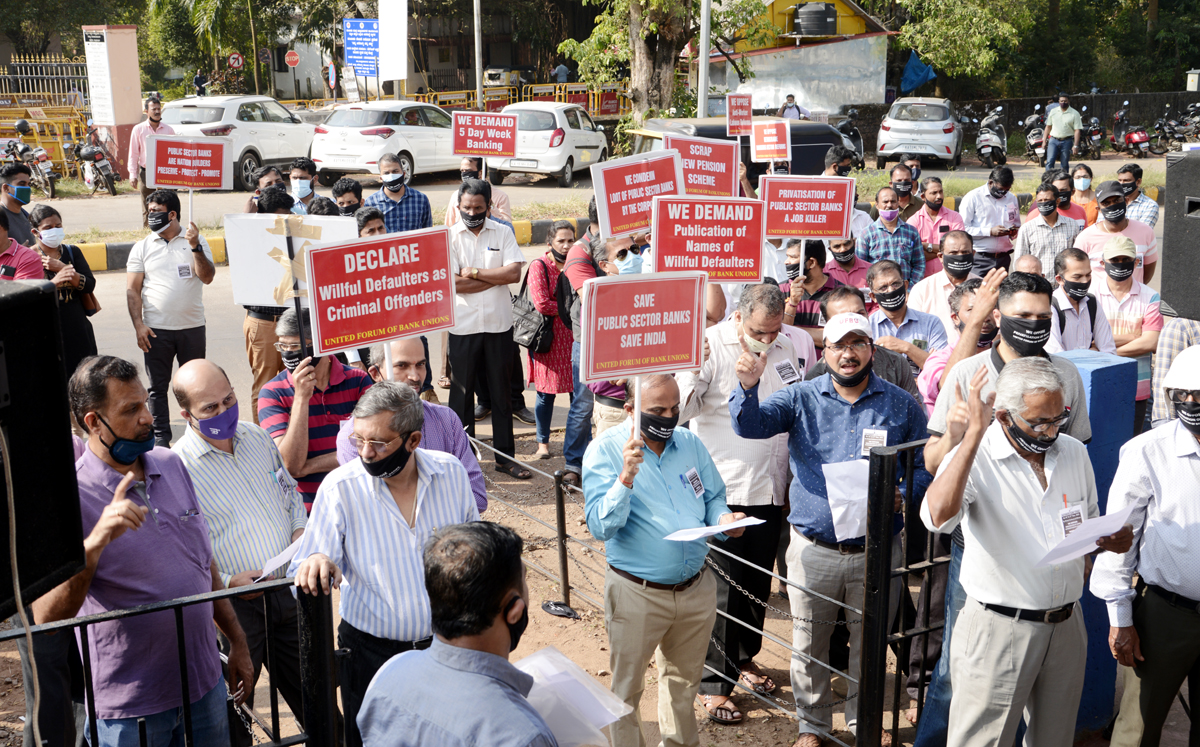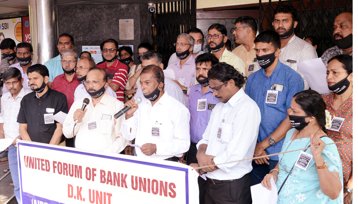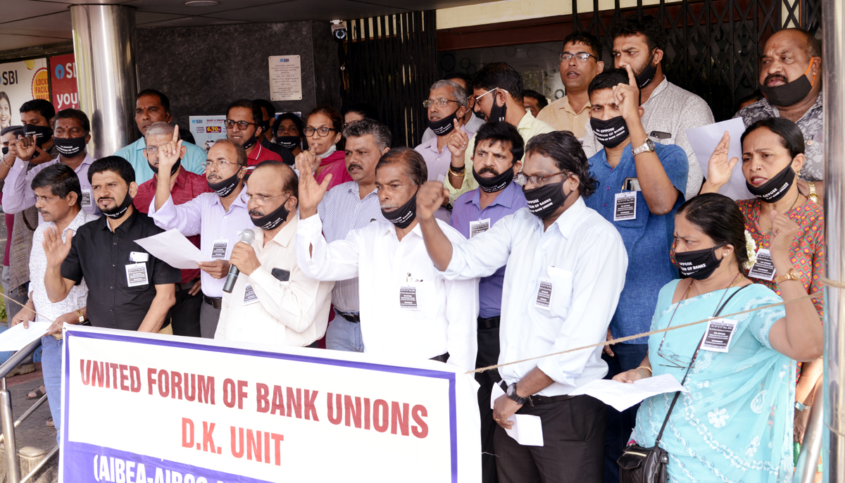 ರಾಷ್ಟ್ರೀಕೃತ ಬ್ಯಾಂಕ್ಗಳ ಖಾಸಗೀಕರಣ ಹಾಗೂ ಬ್ಯಾಂಕಿಂಗ್ ಕಾನೂನು (ತಿದ್ದುಪಡಿ) ಮಸೂದೆ -2021ವಿರೋಧಿಸಿ ಬ್ಯಾಂಕ್ ಸಂಘಟನೆಗಳ ಸಂಯುಕ್ತ ವೇದಿಕೆ ನೇತೃತ್ವದಲ್ಲಿ ಅಖಿಲ ಭಾರತ ಬ್ಯಾಂಕ್ ಮುಷ್ಕರ ಕರೆಯಂತೆ ದಕ್ಷಿಣ ಕನ್ನಡ ಜಿಲ್ಲೆಯಲ್ಲಿಯೂ ಇಂದು ಬ್ಯಾಂಕ್ಗಳು ಮುಷ್ಕರದಲ್ಲಿ ಪಾಲ್ಗೊಂಡವು.