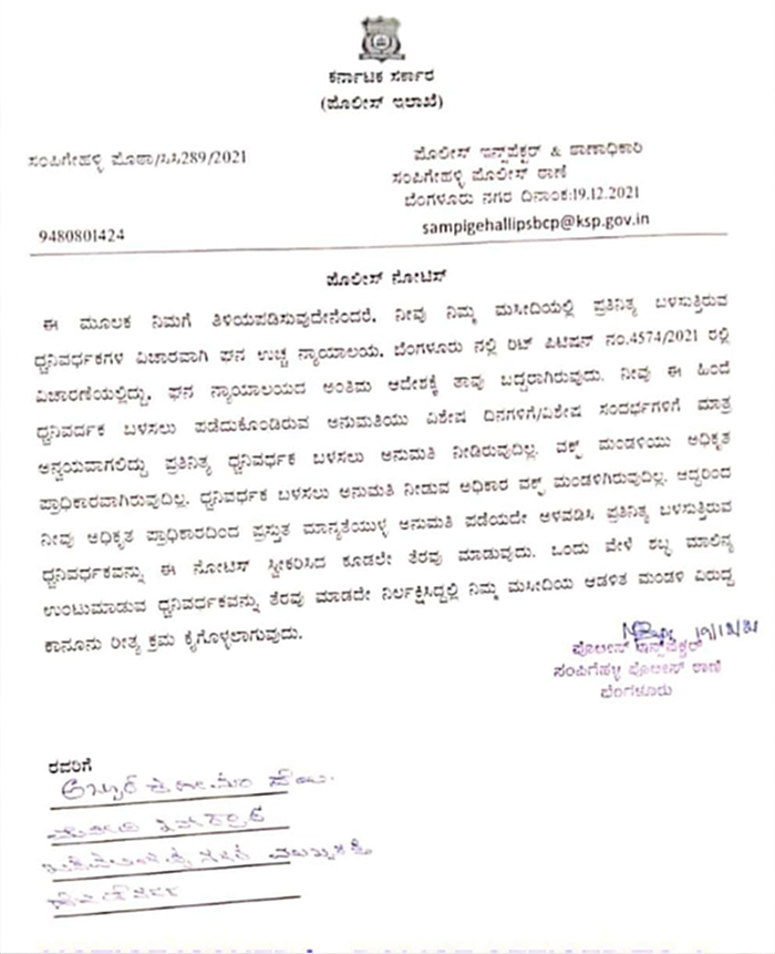 ಮಸೀದಿಗಳಲ್ಲಿ ಪ್ರತಿನಿತ್ಯ ಬಳಸುತ್ತಿರುವ ಧ್ವನಿವರ್ಧಕಗಳ ವಿಚಾರವಾಗಿ ಕರ್ನಾಟಕ ಹೈಕೋರ್ಟ್, ಬೆಂಗಳೂರಿನಲ್ಲಿ ರಿಟ್ ಪಿಟಿಷನ್ ವಿಚಾರಣೆಯಲ್ಲಿದ್ದು, ಕೋರ್ಟ್ ಅಂತಿಮ ಆದೇಶಕ್ಕೆ ತಾವು ಬದ್ಧರಾಗಿದ್ದೇವೆ ಎಂದು ನೋಟಿಸ್ನಲ್ಲಿ ಉಲ್ಲೇಖಿಸಿದೆ.