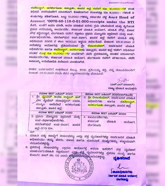 ಅರಕಲಗೂಡು ವ್ಯಾಪ್ತಿಯಲ್ಲಿ ಖರೀದಿ ಮಾಡಿದ್ದ ತಮ್ಮ ಪಿತ್ರಾರ್ಜಿತ ಆಸ್ತಿ ಕಸಬಾ ಹೋಬಳಿ ಕೆಲ್ಲೂರು ಗ್ರಾಮದಲ್ಲಿರುವ ಸರ್ವೇ ನಂಬರ್ 77/2ರಲ್ಲಿ 19 ಗುಂಟೆ ಮತ್ತು 77/10 ರಲ್ಲಿ 5 ಗುಂಟೆ ಬಾಬಿನಲ್ಲಿ ಕ್ರಯಪತ್ರದ ಮುಖಾಂತರ ಸೈಯದ್ ಜಿಯಾ ಉದ್ದೀನ್ ರವರ ಆಸ್ತಿಯನ್ನು ನಿಯಮವನ್ನು ಗಾಳಿಗೆ ತೂರಿ ಬೇರೆಯವರ ಹೆಸರಿಗೆ ಸರ್ವೇ ನಂಬರ್ 77/2ರ ಪೈಕಿ 19 ಗುಂಟೆ ಜಮೀನು ಬೇರೆಯವರ ಹೆಸರಿಗೆ ಖಾತೆ ಮಾಡಿ ಕೊಡಲಾಗಿತ್ತು. ಈ ಸಂಬಂಧ ಸೈಯ್ಯದ್ ಜಿಯಾ ಉದ್ದೀನ್ ಅವರು ಮಾಹಿತಿ ಹಕ್ಕು ಅಧಿನಿಯಮದಡಿ ಈ ಪ್ರಕ್ರಿಯೆಯ ಬಗ್ಗೆ ಆರ್ಟಿಐಗೆ ಅರ್ಜಿ ಸಲ್ಲಿಸಿದ್ದರು. ಸಹ ಯಾವುದೇ ಮಾಹಿತಿ ನೀಡದ ಕಾರಣ ಇತ್ತೀಚೆಗೆ ವರ್ಗಾವಣೆ ಆಗಿರುವ ತಹಶೀಲ್ದಾರ್ ರೇಣುಕುಮಾರ್ ಅವರಿಗೆ ರೂ 10 ಸಾವಿರ ರೂ. ದಂಡ ವಿಧಿಸಿ ಆದೇಶ ಹೊರಡಿಸಿದೆ.