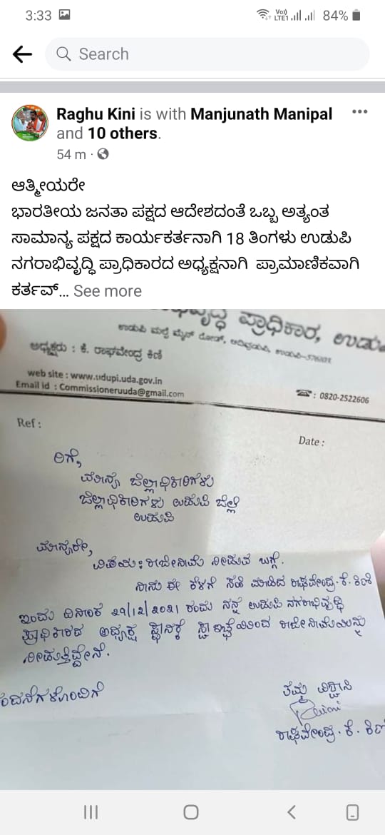 ಉಡುಪಿ ನಗರಾಭಿವೃದ್ಧಿ ಪ್ರಾಧಿಕಾರ ಅಧ್ಯಕ್ಷ ರಾಘವೇಂದ್ರ ಕಿಣಿ ರಾಜೀನಾಮೆ