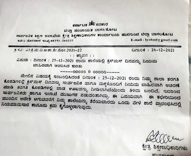 ಈ ಬಗ್ಗೆ ಬಿಇಒ ಹೊರಡಿಸಿರುವ ಜ್ಞಾಪನ ಪತ್ರದಲ್ಲಿ "ಕ್ರಿಸ್ಮಸ್ ಆಚರಿಸಿ ತರಗತಿಯಲ್ಲಿ ಬಾಡೂಟ ನೀಡಿರುವುದು ಸಾರ್ವಜನಿಕರಿಗೆ ಹಾಗು ಶಿಕ್ಷಣ ಇಲಾಖೆಗೆ ಮುಜುಗರ ತಂದಿದೆ" ಎಂದು ಹೇಳಿದ್ದಾರೆ.