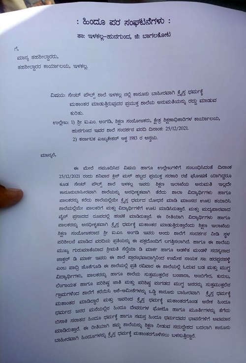 ‘ಡಿ.25ರಂದು ಇಲ್ಲಿನ ಸೇಂಟ್ ಪೌಲ್ಸ್ ಕಾನ್ವೆಂಟ್ ಶಾಲೆಯಲ್ಲಿ ಕ್ರಿಸ್ಮಸ್ ಆಚರಣೆ ನೆಪದಲ್ಲಿ ವಿದ್ಯಾರ್ಥಿಗಳು ಹಾಗೂ ಪಾಲಕರನ್ನು ಸೇರಿಸಿ, ಅವರಿಗೆ ಮಾಂಸದ ಊಟ ಬಡಿಸಿ, ಪ್ರಸಾದವೆಂದು ಮದ್ಯ ಹಾಗೂ ‘ಸತ್ಯವೇದ’ ಎನ್ನುವ ಪುಸ್ತಕ ನೀಡಿದ್ದಾರೆ. ಶಾಲೆಯ ನೆರೆಹೊರೆಯವರು ನೀಡಿದ ದೂರಿನ ಮೇರೆಗೆ ಶಿಕ್ಷಣ ಸಂಯೋಜಕರು ಶಾಲೆಗೆ ಭೇಟಿ ನೀಡಿ, ಬಿಇಒ ಅವರಿಗೆ ವರದಿ ನೀಡಿದ್ದಾರೆ. ಆದರೂ ಈವರೆಗೆ ಶಾಲೆಯ ಸಿಬ್ಬಂದಿ ಹಾಗೂ ಆಡಳಿತ ಮಂಡಳಿ ವಿರುದ್ಧ ಯಾವುದೇ ಕ್ರಮ ಕೈಗೊಂಡಿಲ್ಲ’ ಎಂದು ಸಂಘ ಪರಿವಾರದ ಮುಖಂಡರು ಆರೋಪಿಸಿದ್ದಾರೆ.