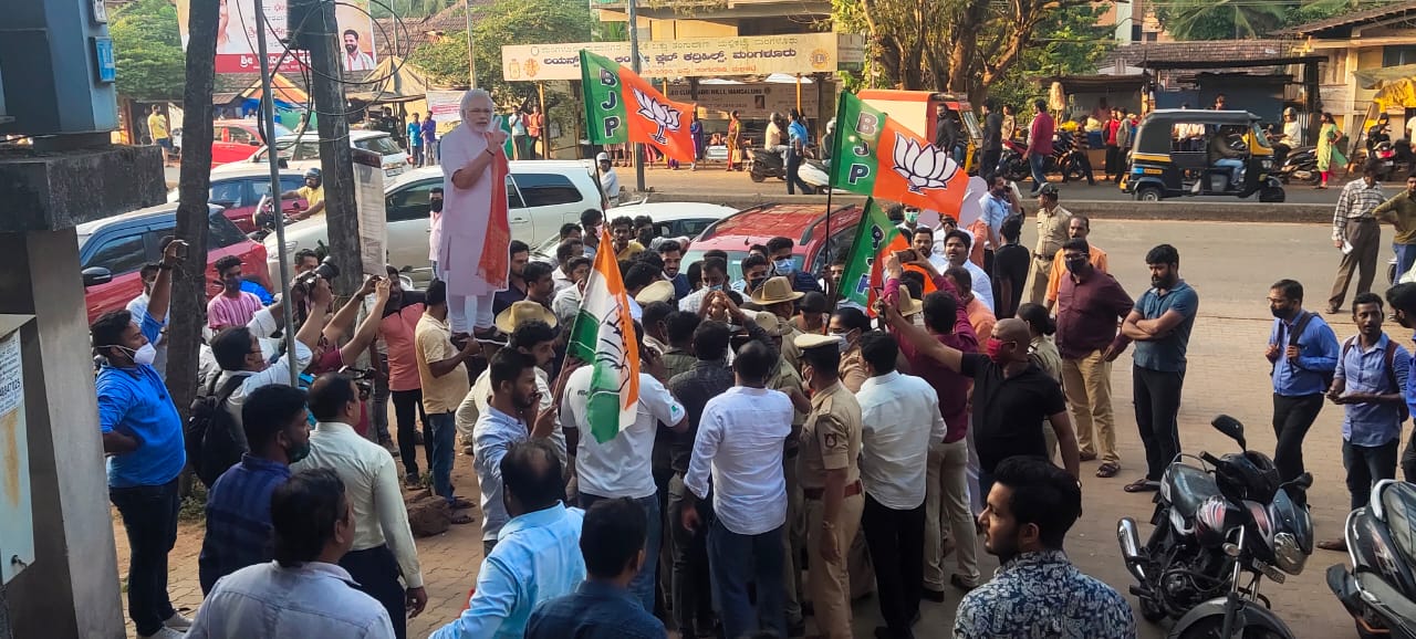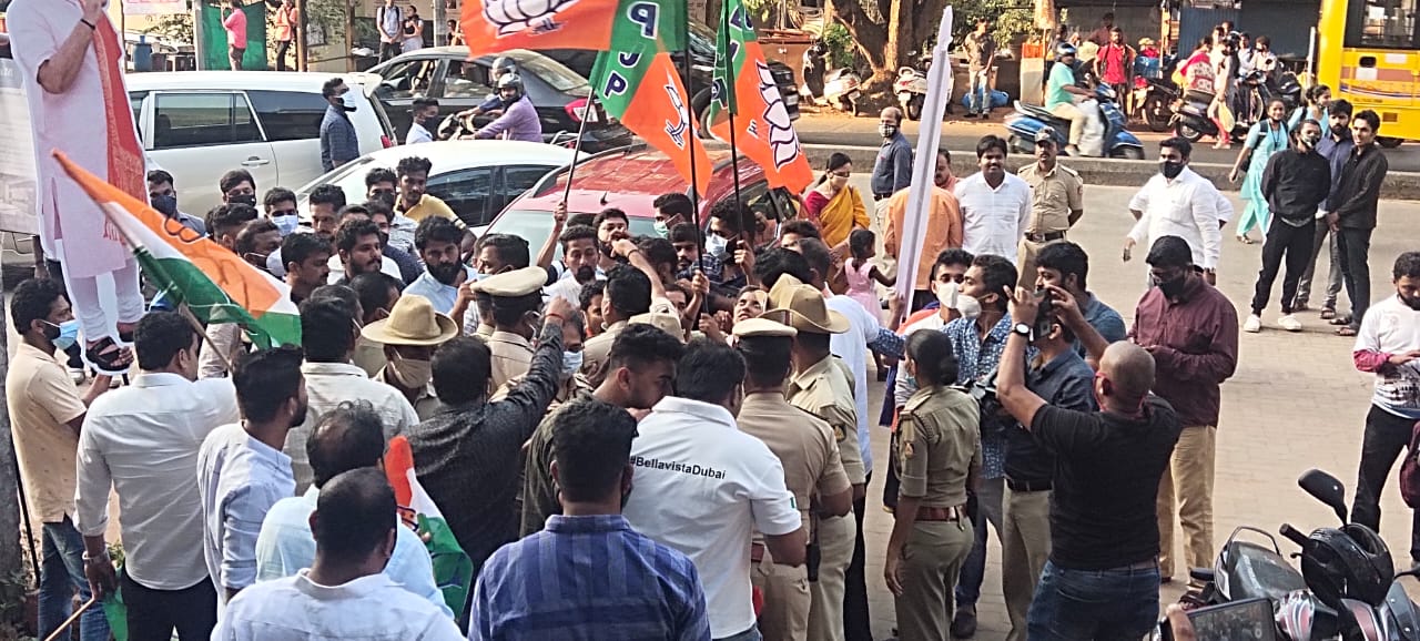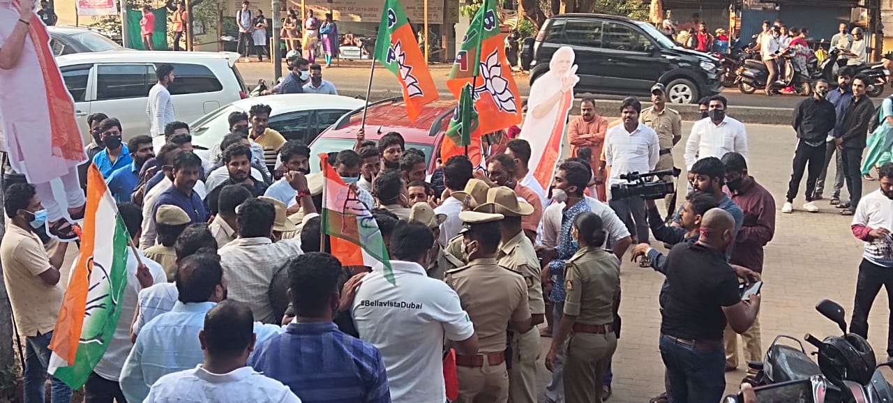 ಬಿಜೆಪಿ ಪ್ರತಿಭಟನೆ ಮುಗಿಯುತ್ತಿದ್ದಂತೆ ಸ್ಥಳಕ್ಕೆ ಆಗಮಿಸಿದ ವಿಧಾನ ಪರಿಷತ್ ಮಾಜಿ ಸದಸ್ಯ ಐವನ್ ಡಿಸೋಜ, ಕಾಂಗ್ರೆಸ್ ಕಾರ್ಯಕರ್ತರನ್ನು ಸೇರಿಸಿಕೊಂಡು ಬಿಜೆಪಿ ಕಚೇರಿ ಬಳಿ ಪ್ರತಿಭಟನೆಗೆ ಮುಂದಾದರು. ಪೊಲೀಸರು ತಕ್ಷಣ ಮಾಹಿತಿ ರವಾನಿಸಿ, ಬಿಜೆಪಿ ಕಚೇರಿ ಬಳಿ ರಸ್ತಗೆ ಯಾರೂ ಪ್ರವೇಶಿಸದಂತೆ ಬ್ಯಾರಿಕೇಡ್ ಅಳವಡಿಸಿದರು. ಸಾಕಷ್ಟು ಮಂದಿ ಬಿಜೆಪಿ ಕಾರ್ಯಕರ್ತರೂ ಅಲ್ಲಿ ಸೇರಿದ್ದರು. ಕಾಲ್ನಡಿಗೆಯಲ್ಲಿ ಬಿಜೆಪಿ ಕಚೇರಿಗೆ ಸಾಗುತ್ತಿದ್ದ ಐವನ್ ಡಿಸೋಜಾ ನೇತೃತ್ವದ ತಂಡವನ್ನು ಬಂಟ್ಸ್ ಹಾಸ್ಟೆಲ್ ಬಳಿಯಲ್ಲೇ ಪೊಲೀಸರು ವಶಕ್ಕೆ ಪಡೆದರು.
