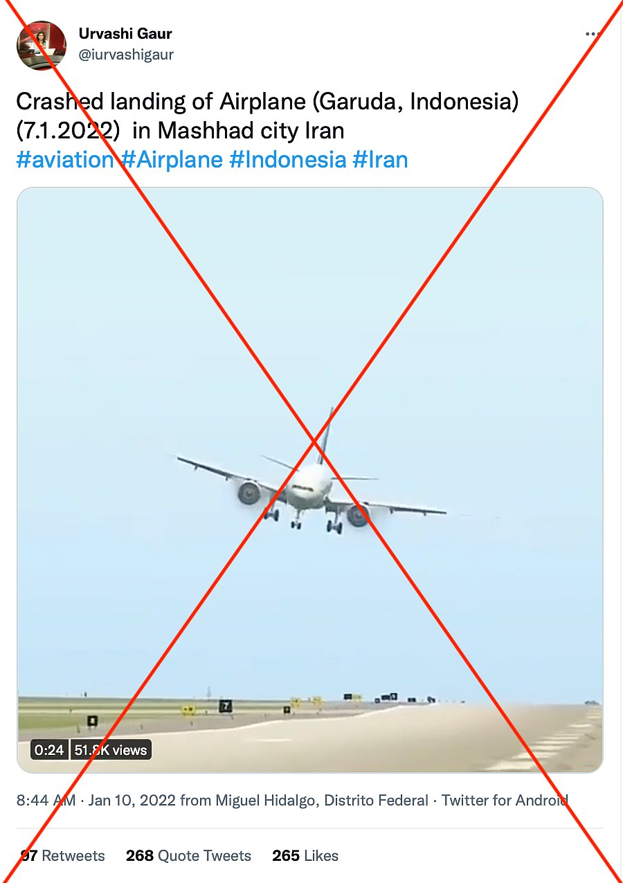 ಕೆಲವು ದಿನಗಳಿಂದ ಸಾಮಾಜಿಕ ಮಾಧ್ಯಮಗಳಲ್ಲಿ ಇರಾನ್ನ ಏರ್ಪೋರ್ಟ್ನಲ್ಲಿ ಇಂಡೋನೇಷಿಯಾ ರಾಷ್ಟ್ರೀಯ ಏರ್ಲೈನ್ ಗರುಡಾ ಇಂಡೋನೇಷಿಯಾ ವಿಮಾನವೊಂದು ಪತನವಾಗಿದೆಯೆಂಬ ವಿಡಿಯೋ ವೈರಲ್ ಆಗುತ್ತಿದೆ.