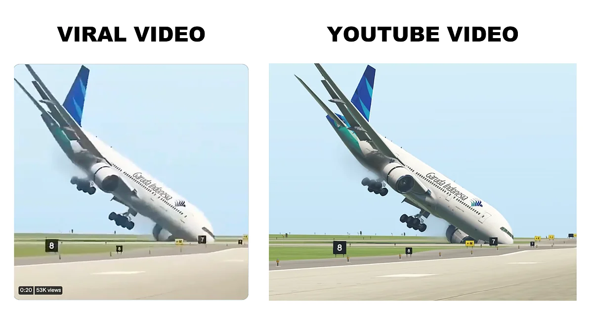 ಇದು ಕಂಪ್ಯೂಟರ್ ಸಹಾಯದಿಂದ ತಯಾರಿಸಿದ ಅನಿಮೇಟೆಡ್ ಕಾಲ್ಪನಿಕ ವೀಡಿಯೊ ಆಗಿದ್ದು, ಇದು ನಿಜವಾಗಿ ನಡೆದ ಅಪಘಾತವಲ್ಲ ಎಂದು AFP ಸತ್ಯಶೋಧನಾ ವರದಿ ಹೇಳಿದೆ. ಎರಡು ವೀಡಿಯೊಗಳನ್ನು ಎಡಿಟಿಂಗ್ ಟೂಲ್ ಗಳನ್ನು ಬಳಸಿ ಸಮ್ಮಿಶ್ರಗೊಳಿಸಲಾಗಿದೆ. ವೀಡಿಯೊದ ಎರಡನೇ ಭಾಗವು ಕ್ಯಾಸ್ಪಿಯನ್ ಏರ್ಲೈನ್ಸ್ ವಿಮಾನವಾಗಿದ್ದು, ಇರಾನ್ನ ಇಸ್ಫಹಾನ್ನಲ್ಲಿ ಲ್ಯಾಂಡಿಂಗ್ ಸಮಯದಲ್ಲಿ ಟಚ್ ಡೌನ್ ವೇಳೆ ಗೇರ್ ಗಳು ಕುಸಿದ ಕಾರಣ ವಿಮಾನವು ರನ್ ವೇಯಿಂದ ಹೊರ ಜಾರಿತ್ತು. ಈ ಘಟನೆ ಜನವರಿ 6ರಂದು ನಡೆದಿತ್ತು ಎನ್ನಲಾಗಿದೆ.