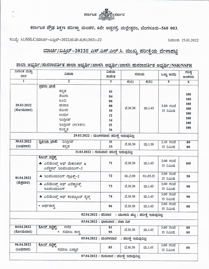 ಬೆಂಗಳೂರು, ಜ.25: 2021-22ನೇ ಸಾಲಿನ ಎಸ್ಎಸ್ಎಲ್ಸಿ ಮುಖ್ಯ ಅಂತಿಮ ಪರೀಕ್ಷೆ ಮಾರ್ಚ್ ಮತ್ತು ಏಪ್ರಿಲ್ ತಿಂಗಳಿನಲ್ಲಿ ನಡೆಯಲಿದ್ದು, ಪರೀಕ್ಷಾ ವೇಳಾಪಟ್ಟಿಯನ್ನು ಕರ್ನಾಟಕ ಪ್ರೌಢ ಶಿಕ್ಷಣ ಪರೀಕ್ಷಾ ಮಂಡಳಿಯು ಪ್ರಕಟಿಸಿದೆ.