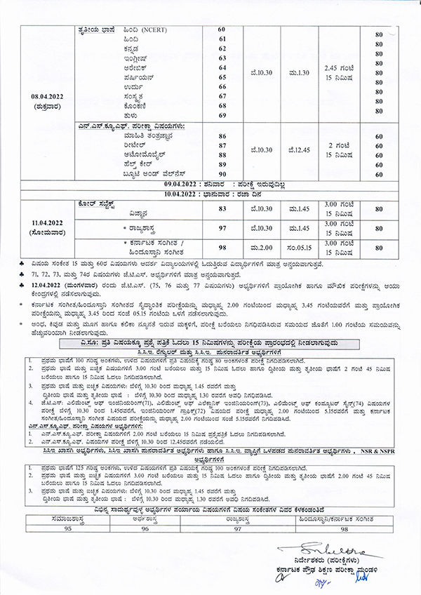 ಏ.4ರಂದು ಗಣಿತ ಮತ್ತು ಸಮಾಜಶಾಸ್ತ್ರ ವಿಷಯಗಳಿಗೆ, ಏ.6ರಂದು ಸಮಾಜ ವಿಜ್ಞಾನ ವಿಷಯಕ್ಕೆ ಪರೀಕ್ಷೆಯನ್ನು ನಡೆಸಲಾಗುವುದು. ಏ.8ರಂದು ತೃತೀಯ ಭಾಷೆ ಹಿಂದಿ,ನ ಹಿಂದಿ(ಎನ್ಸಿಇಆರ್ಟಿ), ಕನ್ನಡ, ಇಂಗ್ಲಿಷ್, ಅರೇಬಿಕ್, ಪರ್ಷಿಯನ್, ಉರ್ದು, ಸಂಸ್ಕೃತ, ಕೊಂಕಣಿ, ತುಳು ವಿಷಯಗಳಿಗೆ ಹಾಗೂ ಎನ್ಎಸ್ಕ್ಯೂಎಫ್ ಪರೀಕ್ಷಾ ವಿಷಯಗಳಾದ ಮಾಹಿತಿ ತಂತ್ರಜ್ಞಾನ, ರೀಟೇಲ್, ಆಟೋಮೋಬೈಲ್, ಹೆಲ್ತ್ ಕೇರ್ ಮತ್ತು ಬ್ಯೂಟಿ ಅಂಡ್ ವೆಲ್ನೆಸ್ ವಿಷಯಗಳಿಗೆ ಪರೀಕ್ಷೆಯನ್ನು ನಡೆಸಲಾಗುವುದು.