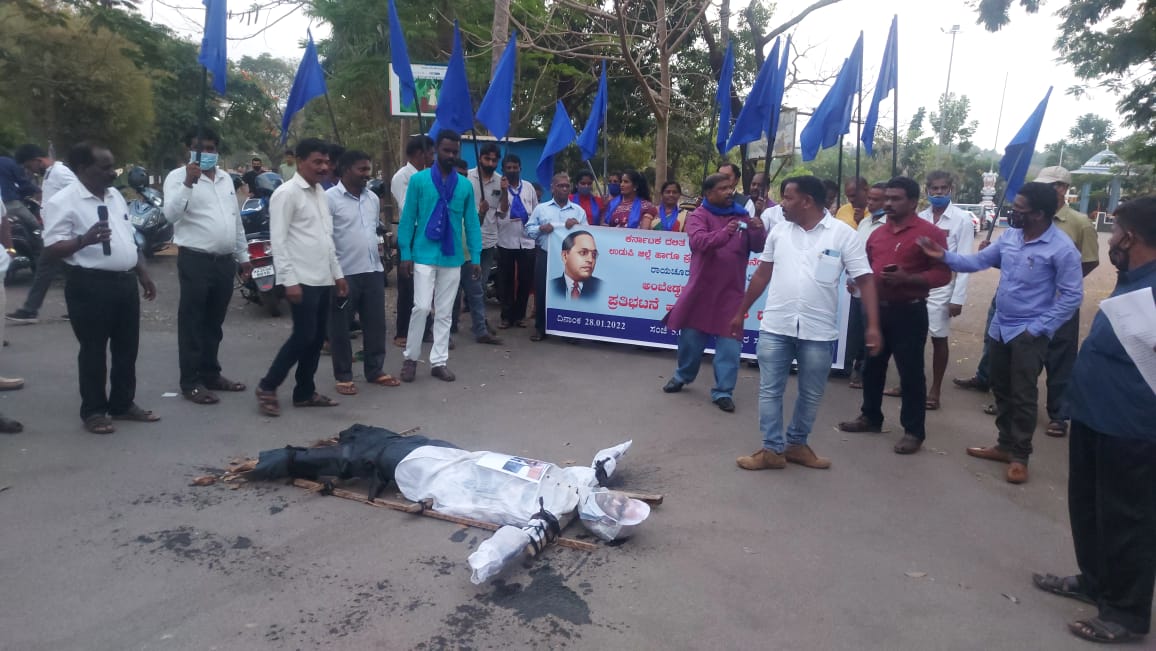ರಾಯಚೂರಿನಲ್ಲಿ ನಡೆದ ಗಣರಾಜ್ಯೋತ್ಸವ ಕಾರ್ಯಕ್ರಮದಲ್ಲಿ ಇರಿಸಿದ್ದ ಅಂಬೇಡ್ಕರ್ ಭಾವಚಿತ್ರ ತೆರವು ಗೊಳಿಸಿ ಧ್ವಜಾರೋಹಣ ಮಾಡಿದ ಜಿಲ್ಲಾ ನ್ಯಾಯಾಧೀಶ ಮಲ್ಲಿಕಾರ್ಜುನ ಗೌಡರನ್ನು ಕೂಡಲೇ ಹುದ್ದೆಯಿಂದ ವಜಾಗೊಳಿಸಬೇಕೆಂದು ಆಗ್ರಹಿಸಿ ಕರ್ನಾಟಕ ದಲಿತ ಸಂಘರ್ಷ ಸಮಿತಿ ಅಂಬೇಡ್ಕರ್ ವಾದ ಉಡುಪಿ ಜಿಲ್ಲಾ ಸಮಿತಿಯ ನೇತೃತ್ವದಲ್ಲಿ ಉಡುಪಿ ಅಜ್ಜರಕಾಡು ಹುತಾತ್ಮ ಸ್ಮಾರಕದ ಬಳಿ ಶುಕ್ರವಾರ ಹಮ್ಮಿಕೊಳ್ಳಲಾದ ಪ್ರತಿಭಟನೆ ಯನ್ನುದ್ದೇಶಿಸಿ ಅವರು ಮಾತನಾಡುತಿದ್ದರು.