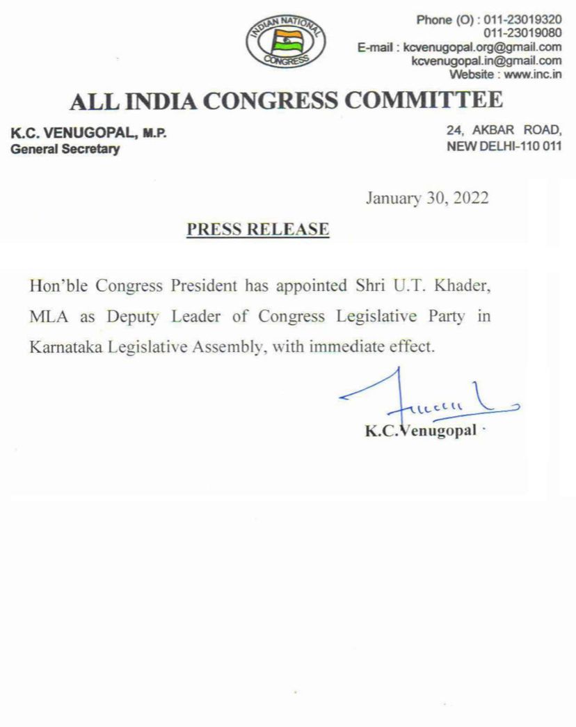 ಬೆಂಗಳೂರು: ವಿಧಾನಸಭೆ ವಿಪಕ್ಷ ಉಪನಾಯಕನಾಗಿ ಮಾಜಿ ಸಚಿವ ಯು.ಟಿ.ಖಾದರ್ ಅವರನ್ನು ನೇಮಿಸಿ ಕಾಂಗ್ರೆಸ್ ಹೈಕಮಾಂಡ್ ಆದೇಶ ಹೊರಡಿಸಿದೆ.