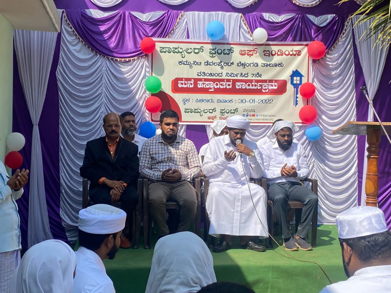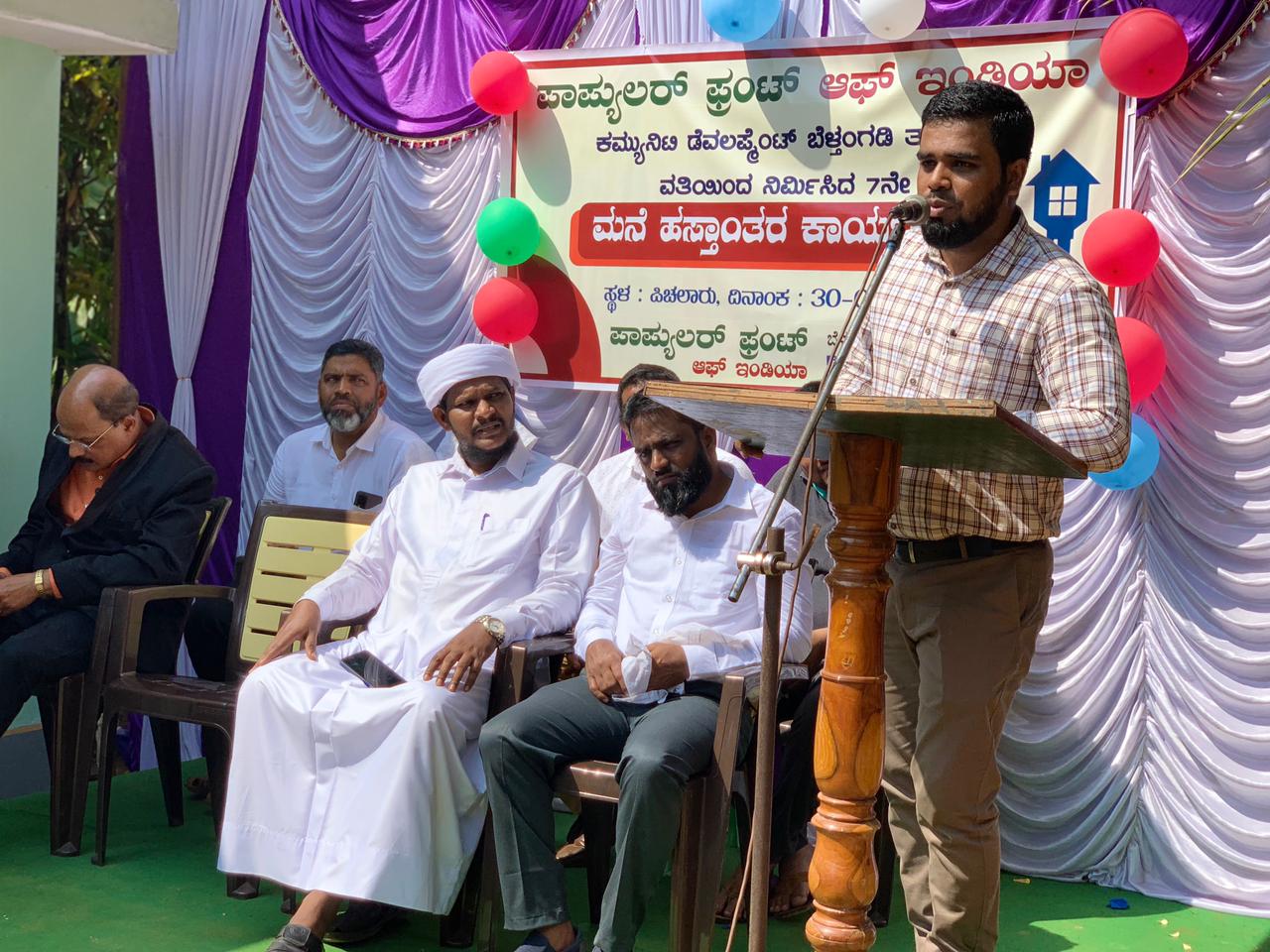 ಪಾಪ್ಯುಲರ್ ಫ್ರಂಟ್ ಆಫ್ ಇಂಡಿಯಾ ರಾಜ್ಯ ಕಾರ್ಯದರ್ಶಿ ಎ.ಕೆ ಅಶ್ರಫ್ ಬಡ ಕುಟುಂಬಕ್ಕೆ ಮನೆಯ ಕೀ ನೀಡುವ ಮೂಲಕ ಹಸ್ತಾಂತರಿಸಿದರು. ಬಳಿಕ ಮಾತನಾಡಿ ಕಾರ್ಯಕರ್ತರ ಸೇವೆಯನ್ನು ಹಾಗೂ ದಾನಿಗಳ ಸಹಾಯವನ್ನು ಶ್ಲಾಘಿಸಿದರು.