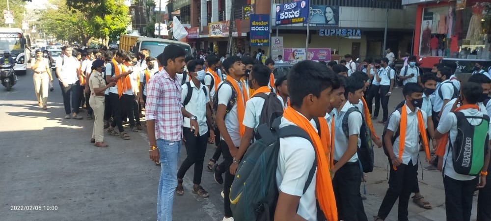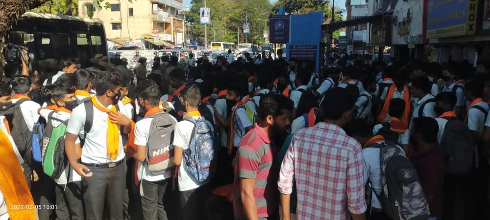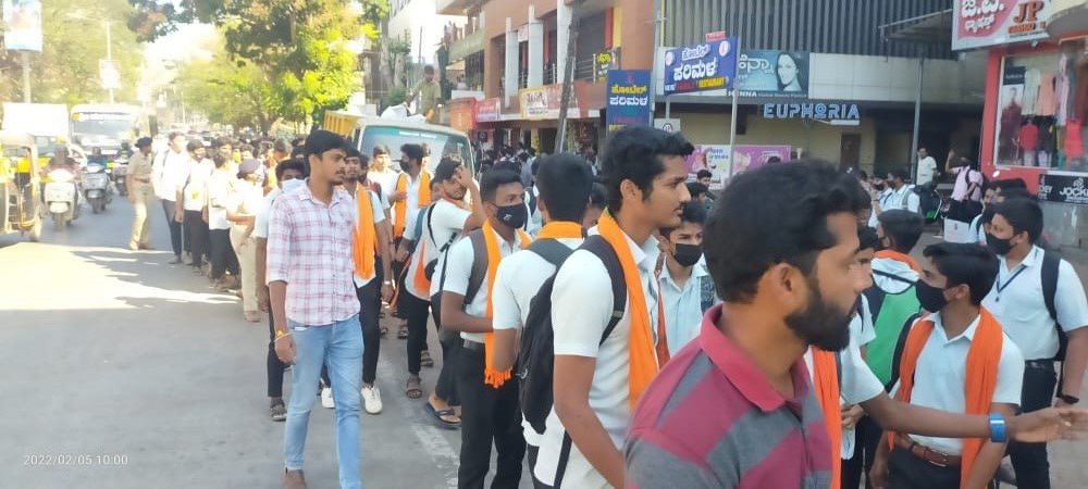 ಆರ್.ಎನ್ ಶೆಟ್ಟಿ ಕಾಲೇಜಿನ ಕೆಲವು ವಿದ್ಯಾರ್ಥಿಗಳು ಕುಂದೇಶ್ವರ ಬಳಿಯಿಂದ ಕೇಸರಿ ಶಾಲು ಧರಿಸಿ ಮೆರವಣಿಗೆ ಮೂಲಕ ಕಾಲೇಜಿಗೆ ಆಗಮಿಸಿದರು. ಮುಸ್ಲಿಂ ವಿದ್ಯಾರ್ಥಿನಿಯರು ಹಿಜಾಬ್ ಧರಿಸಿ ಕಾಲೇಜಿಗೆ ಬಂದರೆ ನಾವು ಕೇಸರಿ ಶಾಲು ಧರಿಸುತ್ತೇವೆ ಎಂದು ವಿದ್ಯಾರ್ಥಿಗಳು ಪಟ್ಟು ಹಿಡಿದರು. ಜೈ ಶ್ರೀರಾಮ್, ಜೈ ಶಿವಾಜಿ ಎಂದು ಘೋಷಣೆಗಳನ್ನು ಕೂಗಿದರು.