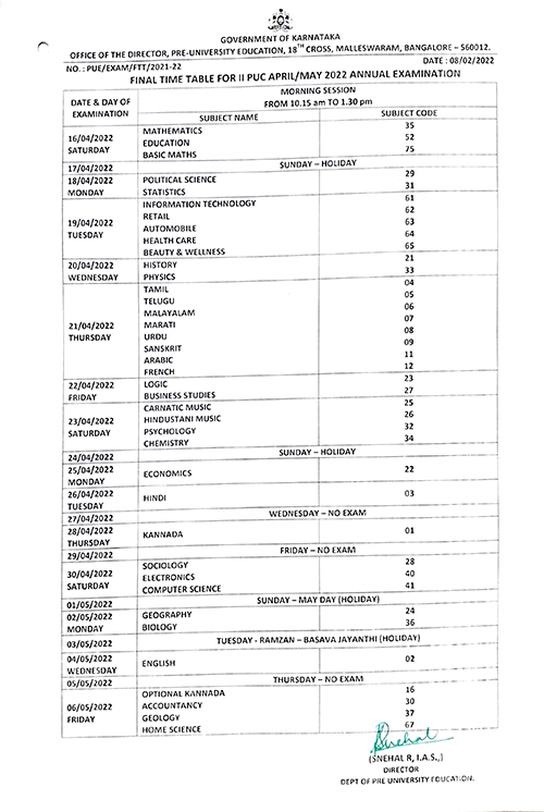 ದ್ವಿತೀಯ ಪಿಯು ವಾರ್ಷಿಕ ಪರೀಕ್ಷೆಯ ವೇಳಾಪಟ್ಟಿ ಪ್ರಕಟ