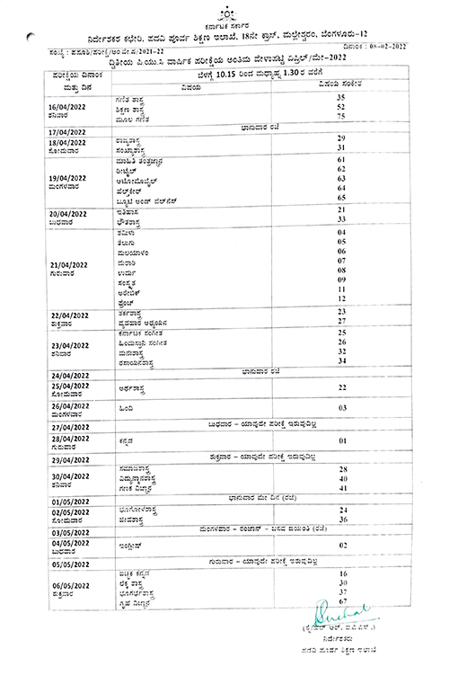 ಎ 20ರಂದು - ಇತಿಹಾಸ, ರಾಜ್ಯಶಾಸ್ತ್ರ, ಎ 21ರಂದು - ತಮಿಳು, ತೆಲಗು, ಮಲಯಾಳಂ, ಮರಾಠಿ, ಉರ್ದು, ಸಂಸ್ಕೃತ, ಅರೇಬಿಕ್, ಫ್ರೆಂಚ್, ಏ 22ರಂದು - ತರ್ಕಶಾಸ್ತ್ರ, ವ್ಯವಹಾರ ಅಧ್ಯಯನ ನಡೆಯಲಿದೆ.