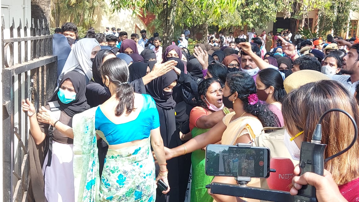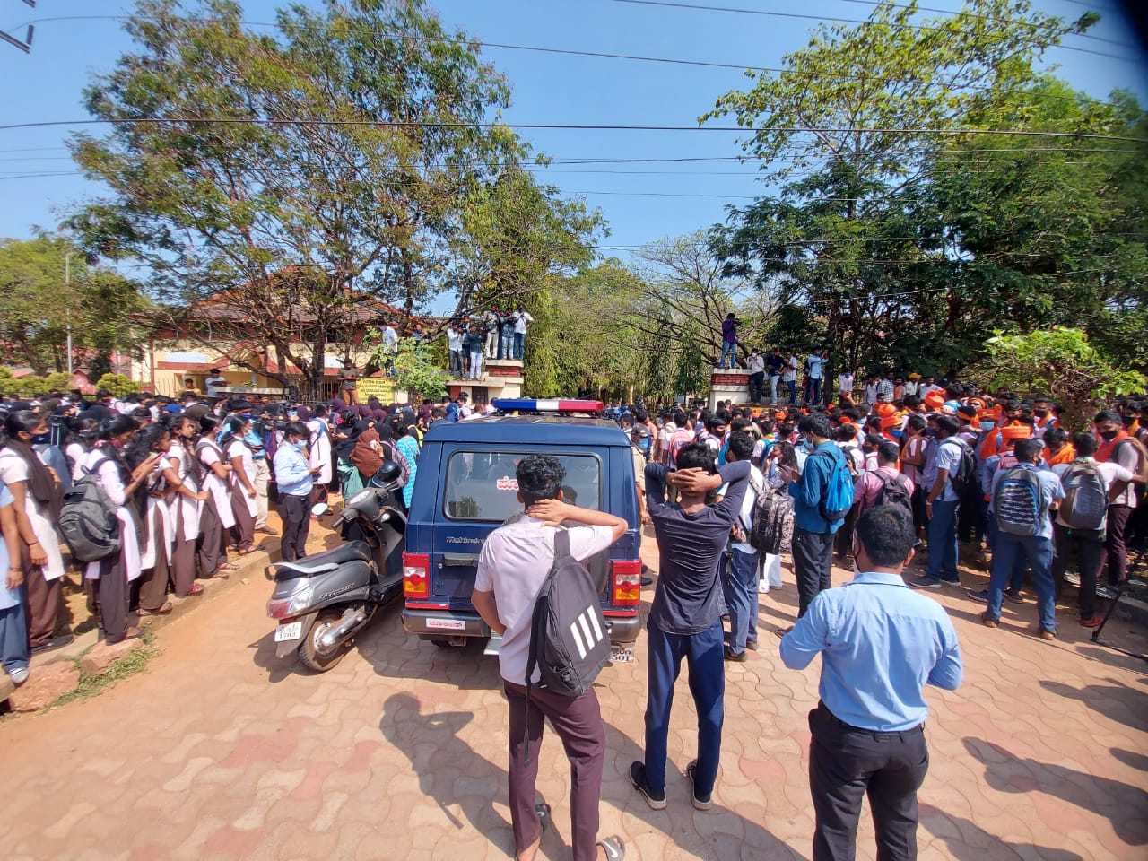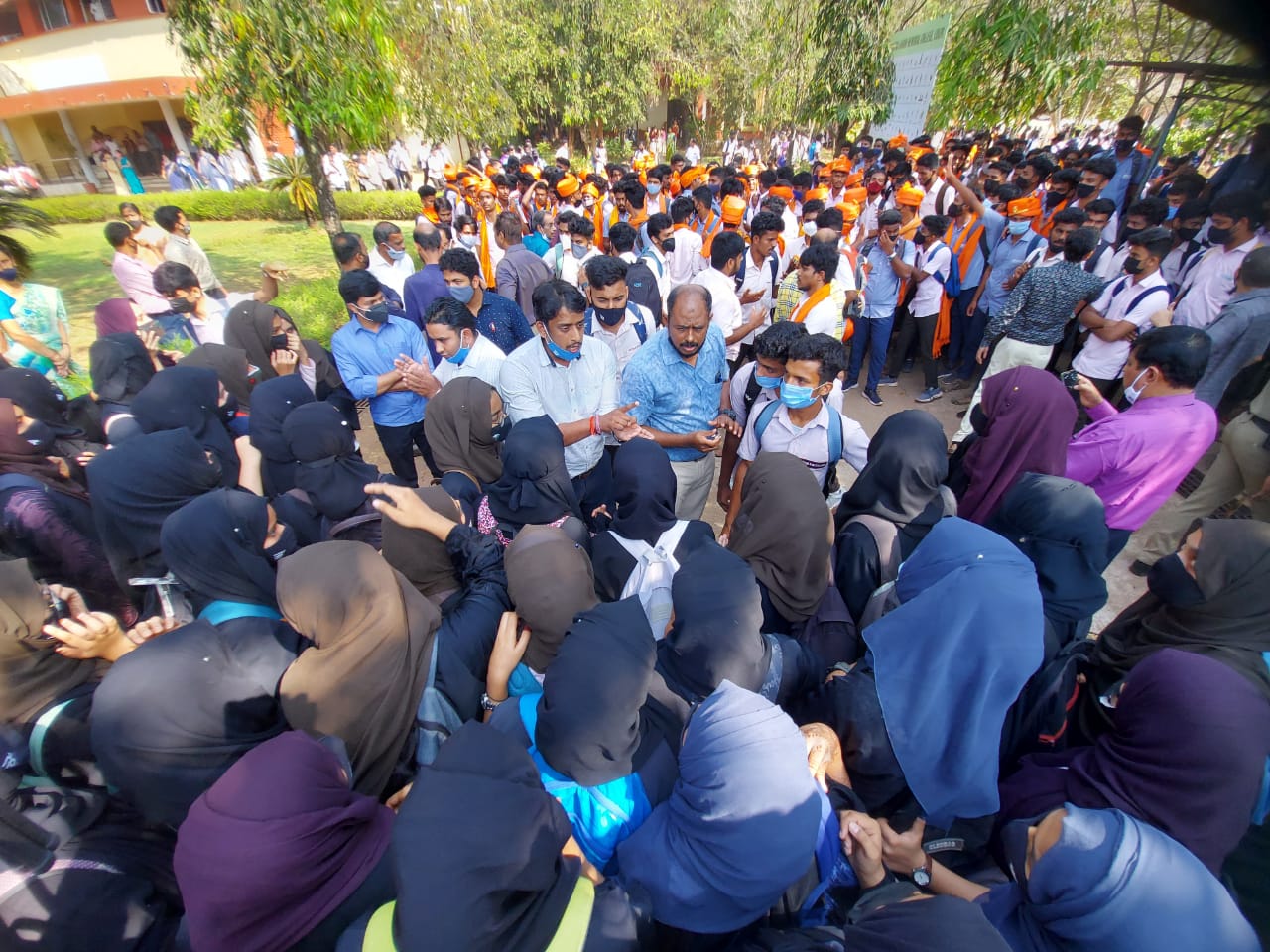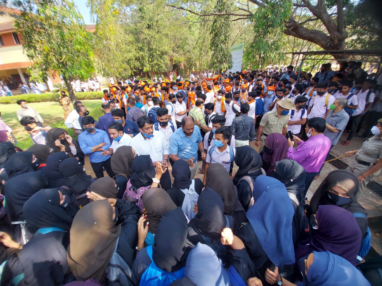 ಕಾಲೇಜು ಆವರಣದೊಳಗೆ ಹಿಜಾಬ್ ಧರಿಸಿದ ವಿದ್ಯಾರ್ಥಿನಿಯರು ಹಾಗೂ ಕೇಸರಿ ಶಾಲು ಮತ್ತು ಪೇಟ ಧರಿಸಿದ ವಿದ್ಯಾರ್ಥಿಗಳು ಮುಖಾಮುಖಿ ಯಾದರು. ಈ ವೇಳೆ ವಿದ್ಯಾರ್ಥಿಗಳು ನ್ಯಾಯ ಬೇಕು ಘೋಷಣೆಗಳನ್ನು ಕೂಗಿದರೆ ಕೇಸರಿ ಶಾಲು ಧರಿಸಿದ ವಿದ್ಯಾರ್ಥಿಗಳು ಜೈಶ್ರೀರಾಮ್, ವಂದೇ ಮಾತರಂ ಘೋಷಣೆಗಳನ್ನು ಕೂಗಿದರು. ಇದರ ಪರಿಣಾಮ ಕಾಲೇಜು ಆವರಣದಲ್ಲಿ ಕೆಲವು ಕಾಲ ಬಿಗುವಿನ ವಾತಾವರಣ ನಿರ್ಮಾಣವಾಯಿತು.