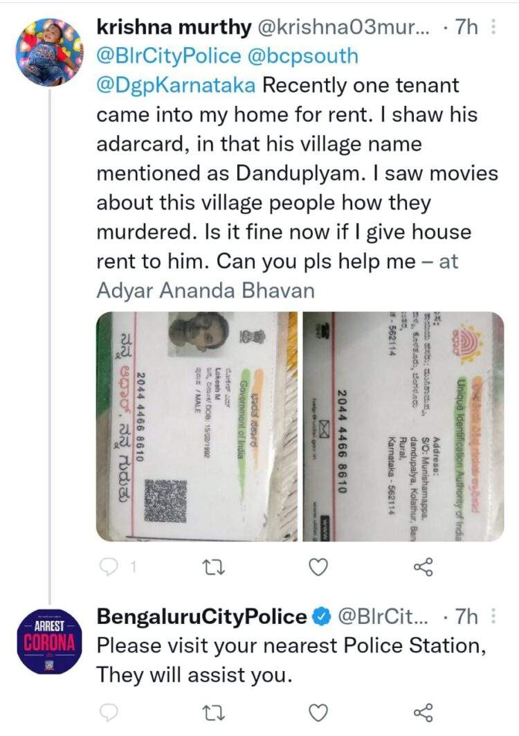 ಮನೆಗೆ ಇತ್ತೀಚೆಗೆ ಓರ್ವ ಬಾಡಿಗೆದಾರ ಬಂದಿದ್ದು, ಅವರ ಆಧಾರ್ಕಾರ್ಡ್ನಲ್ಲಿ ಹಳ್ಳಿಯ ಹೆಸರನ್ನು ದಂಡುಪಾಳ್ಯ ಎಂದು ನಮೂದಿಸಲಾಗಿದೆ. ಇದರಿಂದ ಆತಂಕ ವ್ಯಕ್ತವಾಗಿದ್ದು, ದಂಡುಪಾಳ್ಯದವರಿಗೆ ಮನೆ ಬಾಡಿಗೆ ಕೊಡಬಹುದೇ ಎಂದು ಟ್ವೀಟ್ ಮೂಲಕ ಪೆÇಲೀಸರ ಸಲಹೆ ಕೇಳಿದ್ದಾರೆ.