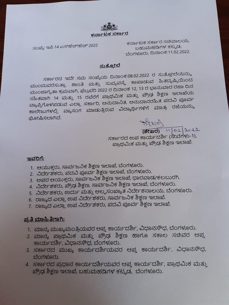 ಫೆ. 14,15ರಂದು ಪಿಯು ಕಾಲೇಜಿಗೆ ರಜೆ