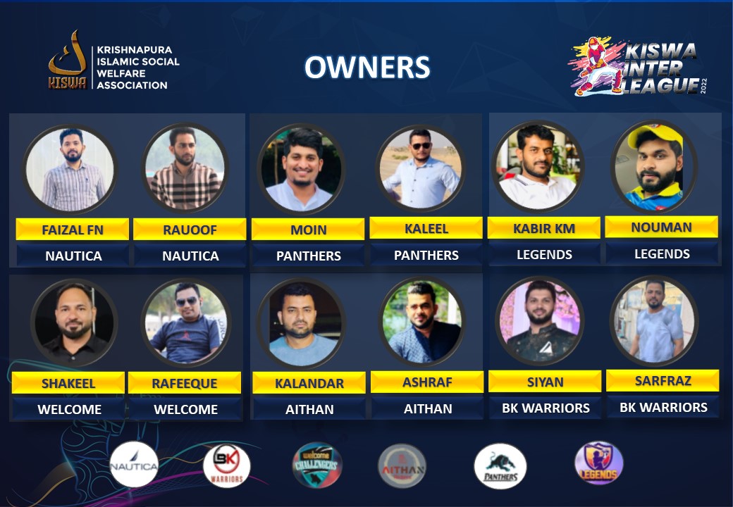 ಕಬೀರ್ ಮತ್ತು ನೌಮಾನ್ ಮಾಲಕತ್ವದ 'ಲೆಜೆಂಡ್ಸ್', ಫೈಝಲ್FN ಮತ್ತು ರಹೂಫ್ ಮಾಲಕತ್ವದ 'ನೌಟಿಕಾ', ಮೋಹಿನ್ ಮತ್ತು ಖಲೀಲ್ ಮಾಲಕತ್ವದ 'ಪ್ಯಾಂಥರ್ಸ್', ಶಕೀಲ್ ವೆಲ್ಕಮ್ ಮತ್ತು ರಫೀಕ್ ಮಾಲಕತ್ವದ  'ವೆಲ್ಕಮ್ ಚಾಲೆಂಜರ್ಸ್', ಕಲಂದರ್ ಮತ್ತು ಅಶ್ರಫ್ ಮಾಲಕತ್ವದ 'ಅಯಿತಾನ್  ರೈಡರ್ಸ್', ಸಿಯಾನ್ ಮತ್ತು ಸರ್ಫ್ರಾಝ್ ಮಾಲಕತ್ವದ 'BK ವಾರಿಯರ್ಸ್' ಕ್ರಿಕೆಟ್ ತಂಡಗಳು ಈ ಪ್ರಕ್ರಿಯೆಯಲ್ಲಿ ಭಾಗವಹಿಸಿದ್ದವು.