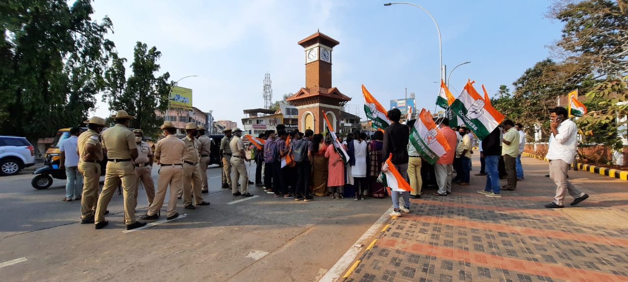 ಮಂಗಳೂರು, ಫೆ.17: ರಾಷ್ಟ್ರಧ್ವಜಕ್ಕೆ ಅವಮಾನ ಮಾಡಿದ ಸಚಿವ ಕೆ.ಎಸ್.ಈಶ್ವರಪ್ಪ ರಾಜೀನಾಮೆ ನೀಡಬೇಕು ಎಂದು ಆಗ್ರಹಿಸಿ ಮಂಗಳೂರು ದಕ್ಷಿಣ ವಿಧಾನಸಭಾ ಕ್ಷೇತ್ರದ ವತಿಯಿಂದ ಗುರುವಾರ ನಗರದ ಹಂಪನಕಟ್ಟೆಯಿಂದ ಕ್ಲಾಕ್ ಟವರ್ವರೆಗೆ ಮೆರವಣಿಗೆ ಹಾಗೂ ಕ್ಲಾಕ್ ಟವರ್ ಬಳಿ ಪ್ರತಿಭಟನೆ ನಡೆಯಿತು.