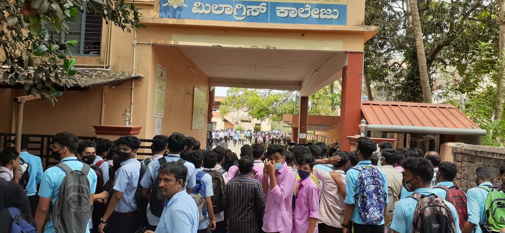 ಉಡುಪಿ, ಫೆ.18: ಹಿಜಾಬ್ ಧಾರಿ ವಿದ್ಯಾರ್ಥಿನಿಯರಿಗೆ ಬೆಂಬಲ ಸೂಚಿಸಿ ನೂರಾರು ವಿದ್ಯಾರ್ಥಿಗಳು ನಡೆಯುತಿದ್ದ ಪರೀಕ್ಷೆಯನ್ನು ಬಹಿಷ್ಕರಿಸಿ ತರಗತಿಗಳಿಂದ ಹೊರಬಂದ ಘಟನೆ ಇಂದು ಕಲ್ಯಾಣಪುರ ಮಿಲಾಗ್ರಿಸ್ ಕಾಲೇಜಿನಲ್ಲಿ ನಡೆದಿದೆ.