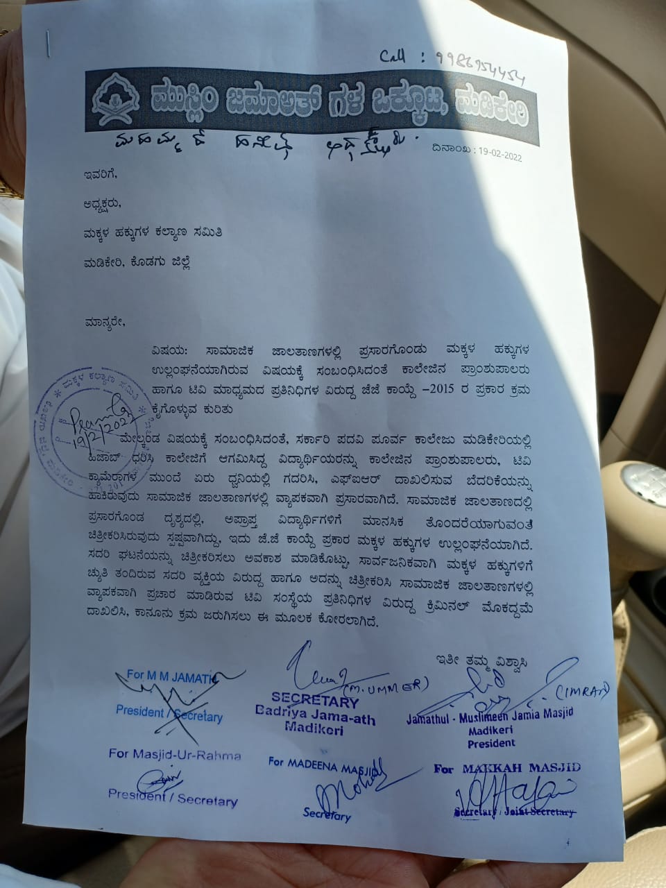 ಮಡಿಕೇರಿಯ ಸರಕಾರಿ ಪದವಿ ಪೂರ್ವ ಕಾಲೇಜಿನಲ್ಲಿ ಹಿಜಾಬ್ ಧರಿಸಿ ಕಾಲೇಜಿಗೆ ಆಗಮಿಸಿದ್ದ ವಿದ್ಯಾರ್ಥಿನಿಯರನ್ನು ಕಾಲೇಜಿನ ಪ್ರಾಂಶುಪಾಲರು ಟಿವಿ ಕ್ಯಾಮರಾಗಳ ಎದುರೇ ಏರು ಧ್ವನಿಯಲ್ಲಿ ಗದರಿಸಿ ಎಫ್ ಐಆರ್ ದಾಖಲಿಸುವ ಬೆದರಿಕೆ ಹಾಕಿರುವುದು ಸಾಮಾಜಿಕ ಜಾಲತಾಣಗಳಲ್ಲಿ ವ್ಯಾಪಕವಾಗಿ ಪ್ರಸಾರವಾಗಿದೆ. ಸಾಮಾಜಿಕ ಜಾಲತಾಣಗಳಲ್ಲಿ ವೈರಲ್ ಆದ ವೀಡಿಯೊದಲ್ಲಿ ಅಪ್ರಾಪ್ತ ವಯಸ್ಸಿನ ವಿದ್ಯಾರ್ಥಿನಿಯರಿಗೆ ಮಾನಸಿಕ ತೊಂದರೆಯಾಗುವಂತೆ ಚಿತ್ರೀಕರಿಸಿರುವುದು ಸ್ಪಷ್ಟವಾಗಿದ್ದು, ಇದು ಜೆಜೆ ಕಾಯ್ದೆ ಪ್ರಕಾರ ಮಕ್ಕಳ ಹಕ್ಕುಗಳ ಉಲ್ಲಂಘನೆಯಾಗಿದೆ. ಆದ್ದರಿಂದ ಈ ಘಟನೆಯನ್ನು ಚಿತ್ರೀಕರಿಸಲು ಅವಕಾಶ ಮಾಡಿಕೊಟ್ಟು, ಸಾರ್ವಜನಿಕವಾಗಿ ಮಕ್ಕಳ ಹಕ್ಕುಗಳಿಗೆ ಚ್ಯುತಿ ತಂದಿರುವ ಕಾಲೇಜಿನ ಪ್ರಾಂಶುಪಾಲರ ವಿರುದ್ಧ ಹಾಗೂ ಅದನ್ನು ಚಿತ್ರೀಕರಿಸಿ ಸಾಮಾಜಿಕ ಜಾಲತಾಣಗಳಲ್ಲಿ ವ್ಯಾಪಕವಾಗಿ ಪ್ರಚಾರ ಮಾಡಿರುವ ಟಿವಿ ಸಂಸ್ಥೆಯ ಪ್ರತಿನಿಧಿಗಳ ವಿರುದ್ಧ ಕ್ರಿಮಿನಲ್ ಮೊಕದ್ದಮೆ ದಾಖಲಿಸಿ, ಕಾನೂನು ಕ್ರಮ ಜರುಗಿಸುವಂತೆ ದೂರಿನಲ್ಲಿ ಒತ್ತಾಯಿಸಲಾಗಿದೆ.