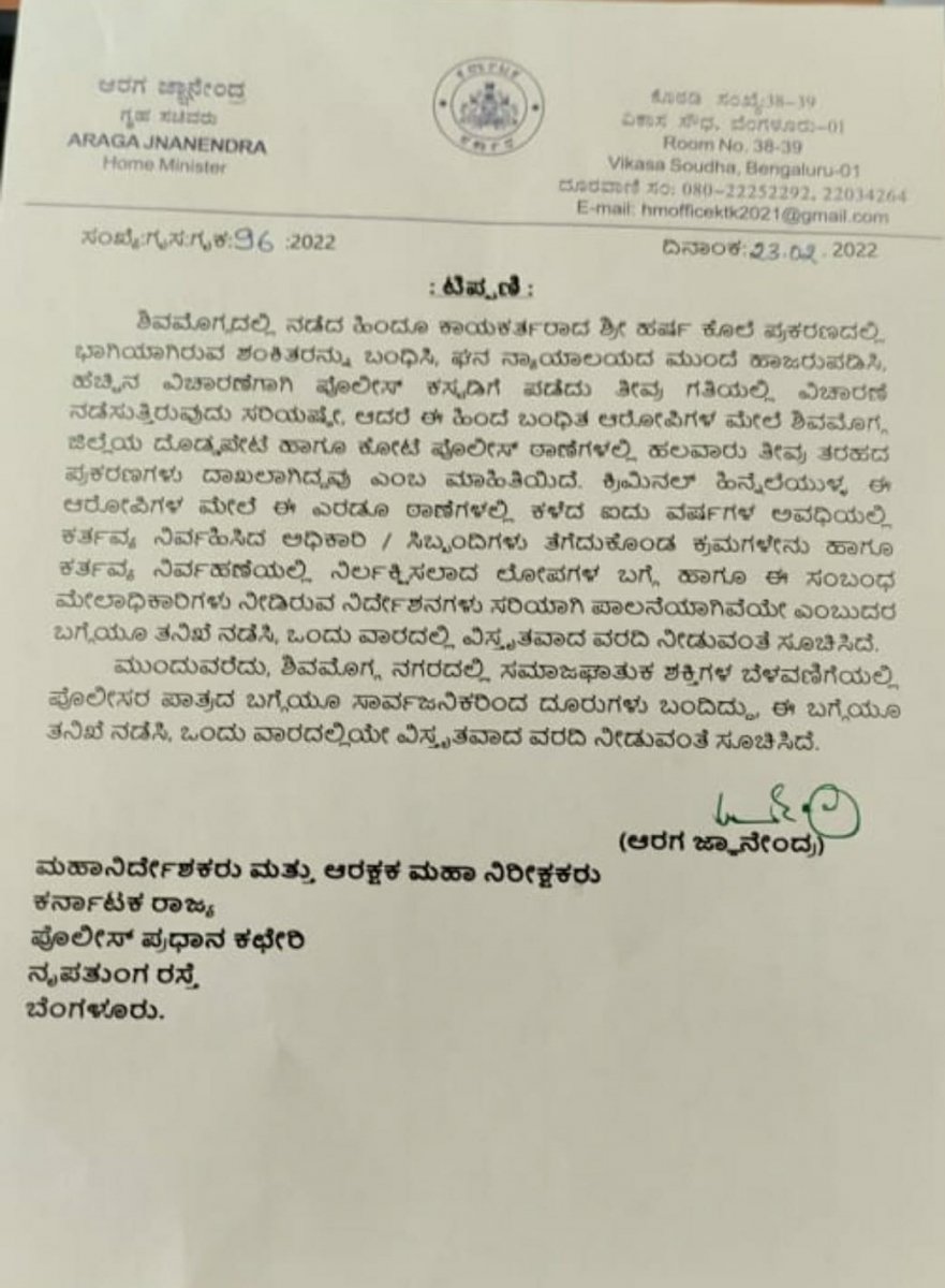 ಶಿವಮೊಗ್ಗದಲ್ಲಿ ಸಮಾಜಘಾತುಕರ ಬೆಳವಣಿಗೆಯಲ್ಲಿ ಪೊಲೀಸರ ಪಾತ್ರದ ಬಗ್ಗೆ ತನಿಖೆಗೆ ಗೃಹಸಚಿವರು ನಿರ್ದೇಶನ