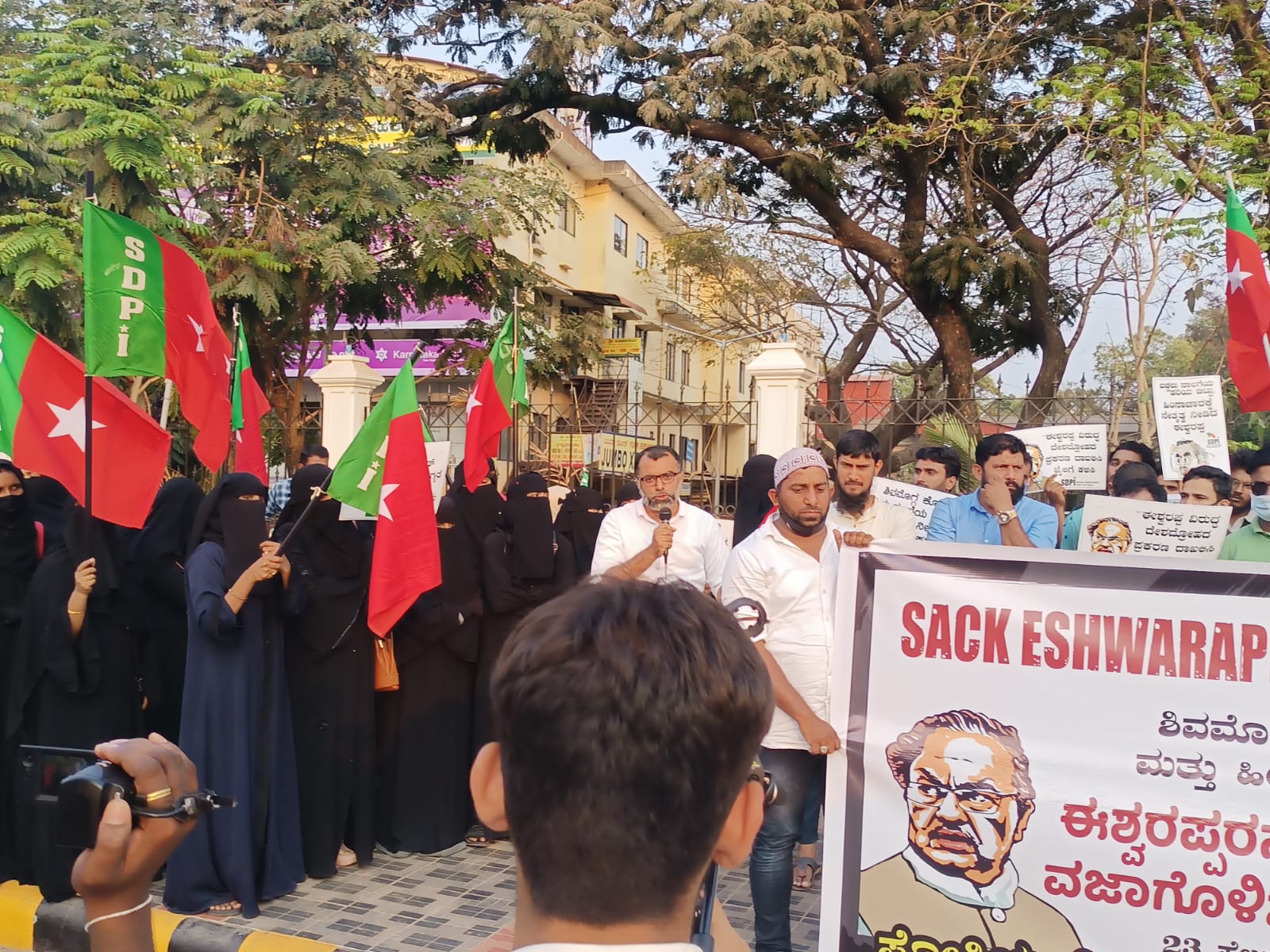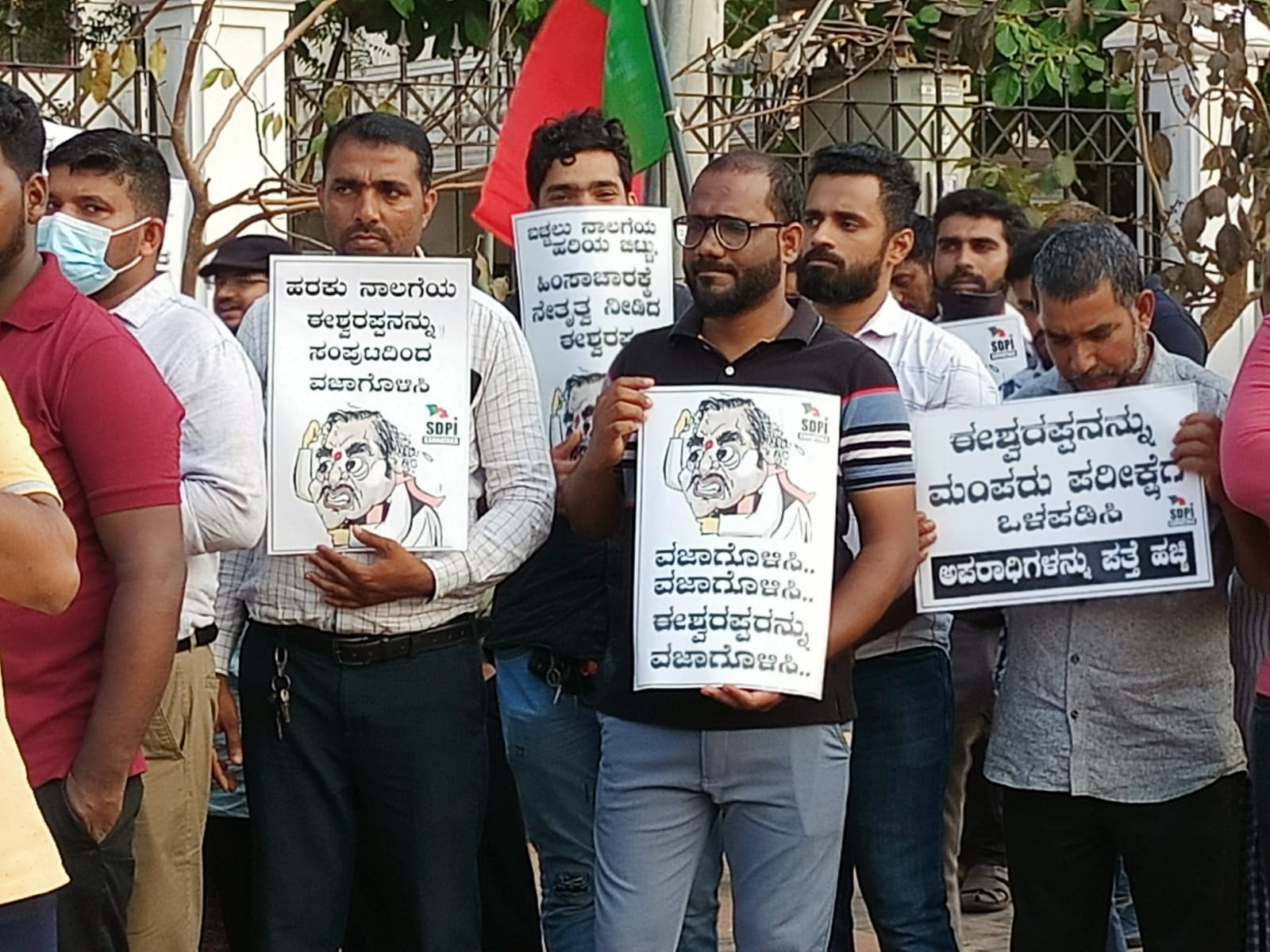 ಮಂಗಳೂರು,ಫೆ.23: ಶಿವಮೊಗ್ಗದಲ್ಲಿ ಗಲಭೆ ಮತ್ತು ಹಿಂಸಾಚಾರಕ್ಕೆ ಪ್ರಚೋದನೆ ನೀಡಿದ ಸಚಿವ ಈಶ್ವರಪ್ಪರನ್ನು ಸಂಪುಟದಿಂದ ವಜಾಗೊಳಿಸಬೇಕು ಎಂದು ಆಗ್ರಹಿಸಿ ಎಸ್ಡಿಪಿಐ ಮಂಗಳೂರು ಉತ್ತರ ಮತ್ತು ದಕ್ಷಿಣ ವಿಧಾನಸಭಾ ಕ್ಷೇತ್ರ ಸಮಿತಿಯ ವತಿಯಿಂದ ನಗರದ ಕ್ಲಾಕ್ ಟವರ್ ಮುಂದೆ ಬುಧವಾರ ಪ್ರತಿಭಟನೆ ನಡೆಯಿತು.