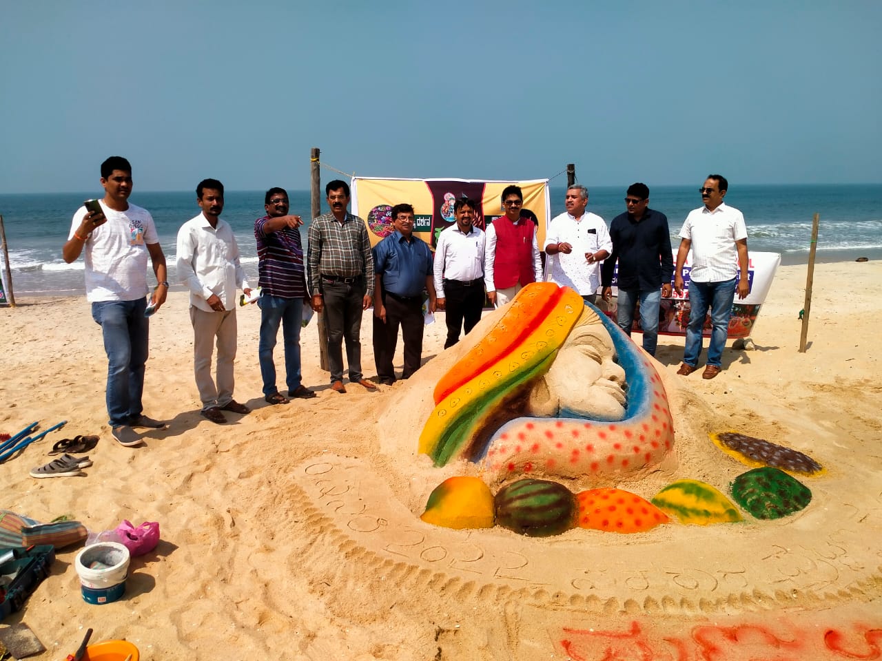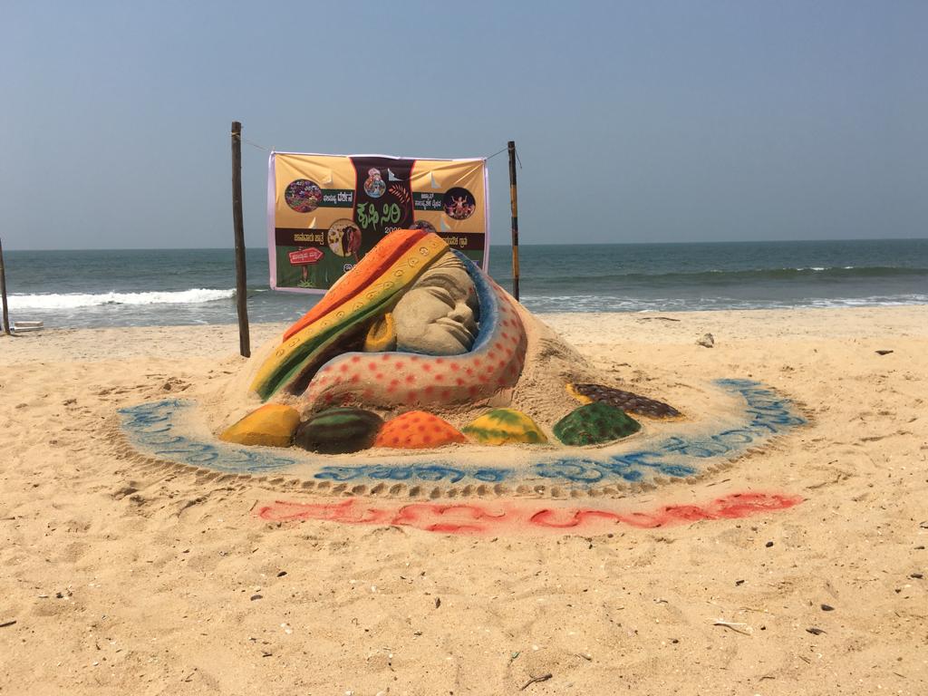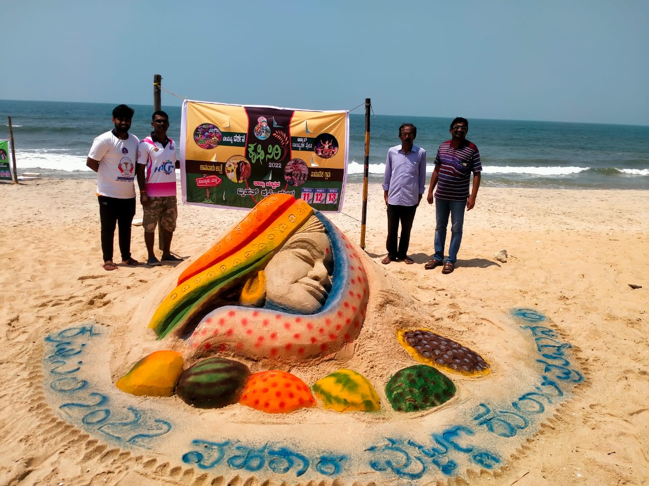 ಕೃಷಿ ಸಿರಿ ರಾಜ್ಯ ಸಮ್ಮೇಳನದ ಪ್ರಯುಕ್ತ ತಣ್ಣೀರು ಭಾವಿ ಬೀಚ್ನಲ್ಲಿ ಮರಳು ಶಿಲ್ಪಕಲಾ ಪ್ರದರ್ಶನ