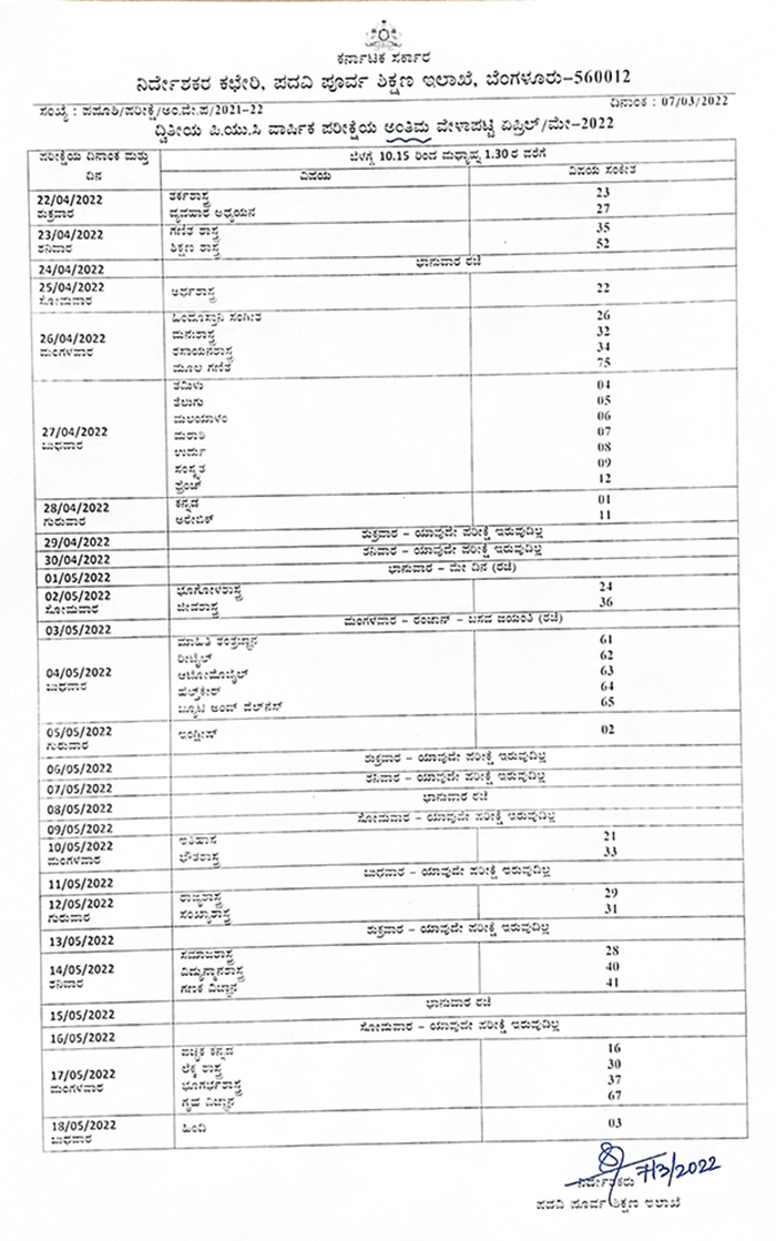 ಬೆಂಗಳೂರು, ಮಾ.7: 2021-22ನೆ ಸಾಲಿನ ದ್ವಿತೀಯ ಪಿಯುಸಿ ವಾರ್ಷಿಕ ಪರೀಕ್ಷೆಯ ಅಂತಿಮ ವೇಳಾಪಟ್ಟಿಯನ್ನು ಪದವಿ ಪೂರ್ವ ಶಿಕ್ಷಣ ಇಲಾಖೆಯು ಸೋಮವಾರ ಪ್ರಕಟಿಸಿ ಆದೇಶ ಹೊರಡಿಸಿದೆ.